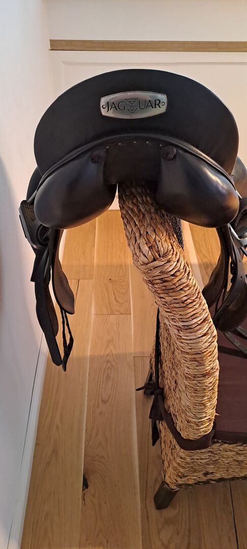 Dressyrsadel Jaguar/ Harry Dabbs - Jaguar dressyrsadel av Harry Dabbs i 17 tum till salu. Med bananpaneler för hästar och ponnyer med kort rygg. Begagnad men i gott skick. Lädret är inte längre djupsvart överallt, på vissa ställen har det ett brunaktigt skimmer, det ska du också se på bilderna.