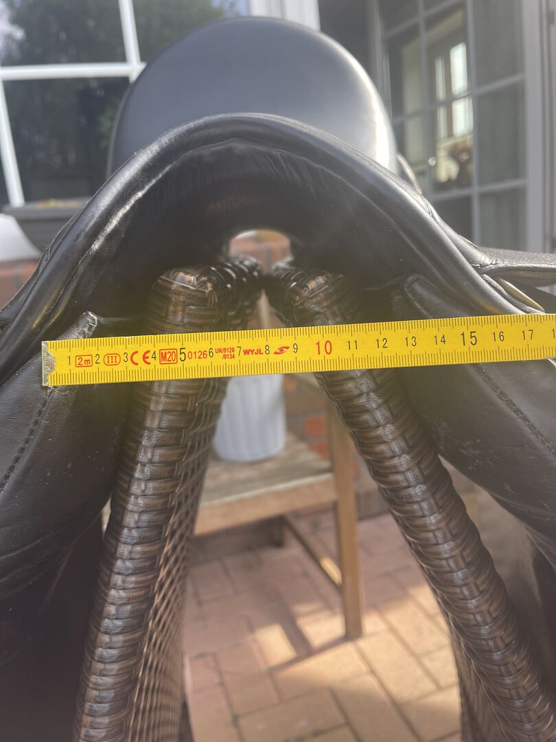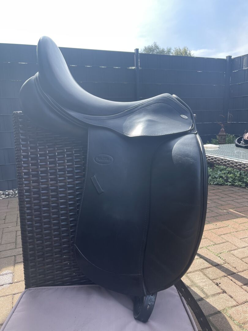 Dressyrsadeln med djupt sadelträd. Stora knärullar med kardborreband. Korta franska paneler lämpliga som sadel för hästar med hög manke och runda, korta eller överbyggda ryggar.
