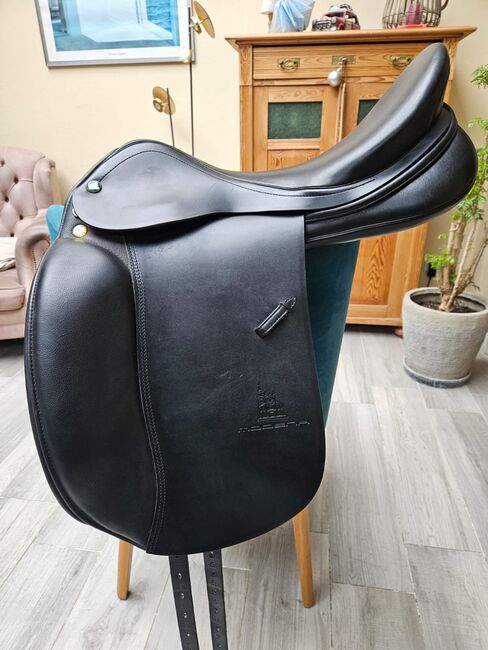 Dressyrsadel Modena från Prestige (32 KW, 18'') - Jag köpte sadeln i oktober 2025 och har bara använt den 5 gånger. Nytt pris var 2390 €, faktura finns tillgänglig. Sadelöverdrag också.