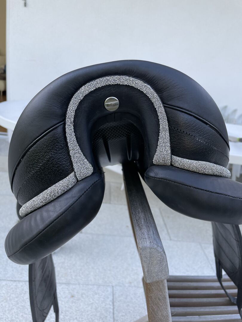 Dressyrsadel Monoblate Devoucoux Makila Harmonie - Säljer min mycket älskade dressyrsadel Devoucoux Makila Harmonie Monoblatt med glitter! Överdragen med buffelskinn, svart, 18". Sadelträdet är av kol och panelerna är av latex. Med vackra glitterdetaljer på baksidan - se foton. Mycket sällan använd, toppskött, toppskick.