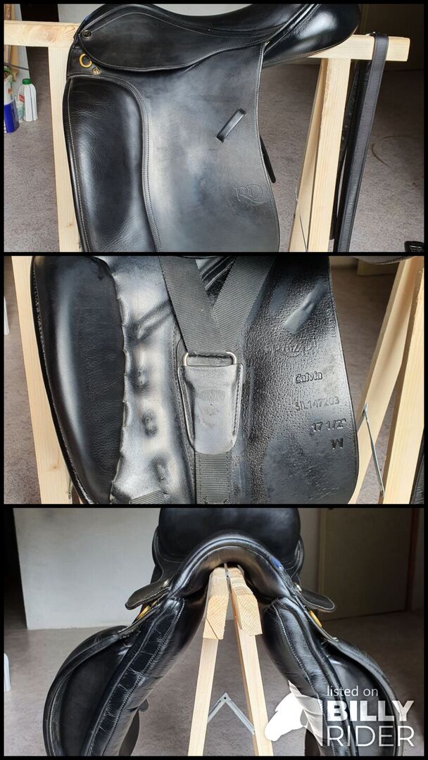 Dressyrsadel Ruiz Diaz Calvia 17,5 - Väl underhållen dressyrsadel av Ruiz Diaz, modell Calvia, sitsstorlek 17,5 tum. Bredd på gullet: W. Sadeln har en högkvalitativ finish och är i mycket gott skick, se foton. Den är också mycket mjuk och bekväm att sitta i. Sadeln kan också enkelt justeras och anpassas (X-Change System). Originalsadelskydd ingår. Utan stigbyglar och stigbyglar. Lädergrimma i 75 cm kan läggas till vid behov. Ursprungspriset var ca 2400 euro. Ingen frakt.