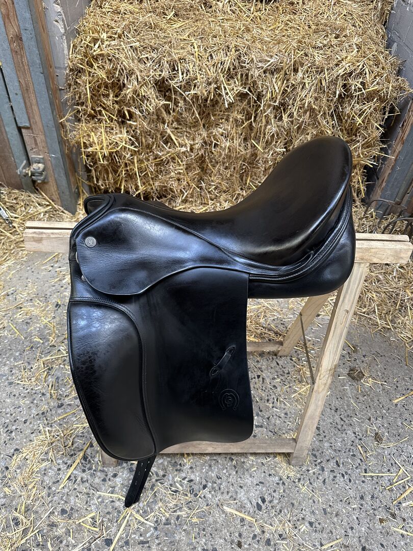 Tyvärr passar sadeln inte min häst, så den säljs med ett tungt hjärta. Sadeln rengjordes och smordes varje vecka och förvarades alltid torrt och med ett skydd i skåpet. Endast lädret och sömmarna har minimala, naturliga tecken på slitage. Det finns ett litet hål längst upp på klaffen som enligt min sadelmakare enkelt kan sys igen när sadeln är vadderad, detta kommer naturligtvis att dras av från köpeskillingen. Sadeln är lika bekväm som en soffa och även med min längd på 1,80 meter kunde jag sitta bekvämt i den.