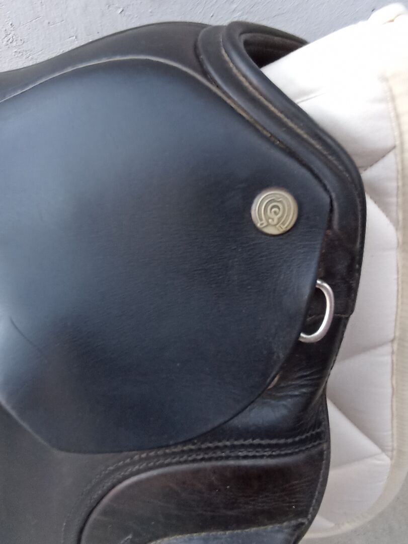 Dressyrsadel SCHUMACHER storlek 2 Dynamic - DRESSUR SATTLE Tillverkare: Otto Schumacher Modell: Profi Dynamic T Monoblat med fastsatta pommels Ungefär 12 år gammal Färg: svart Storlek på sitsen (tum): 2 = 17 Kammarbredd 30 Den är helt lätt att justera Justerbar mattaplatta: ja Material för stoppning: ull Dynans utformning: delade franska paneler med kil Passform: för rak till lätt böjd rygglinje Skick: begagnad - normala tecken på användning Lädret har blivit lite sprött i toppen, det fanns alltid en täckt gelkudde på toppen, den har inte använts på ett tag nu, men INGEN SKROTT! andra egenskaper: Skärs långt bak i axelområdet. flexibelt V-band bifogade dynamiska knärullar Medel-låg midjestorlek i sätet. delade paneler Med sadelöverdrag