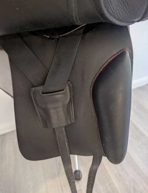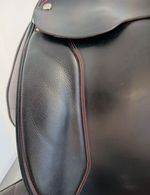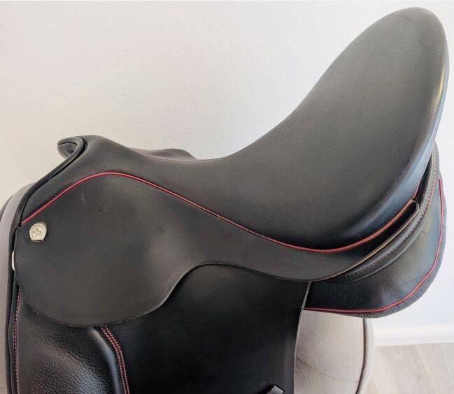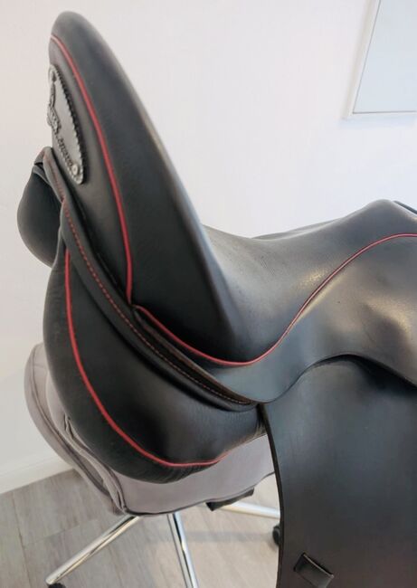Sommer Diplomat DS dressyrsadel kännetecknas av sin universella passform och utmärkta anpassningsförmåga. Med en kontaktyta på endast 46 cm och en kammarbredd på 31,5 cm erbjuder den en idealisk grund för alla typer av hästar. Sadeln har kalljusterbara gälar, en normal sadelklaff, skyddspaneler med mjuk ullfyllning och en djup sits. Den långa sadelgjorden och flexus, som kompletteras med detaljer som piping och sömmar i rött, erbjuder både stil och funktionalitet.