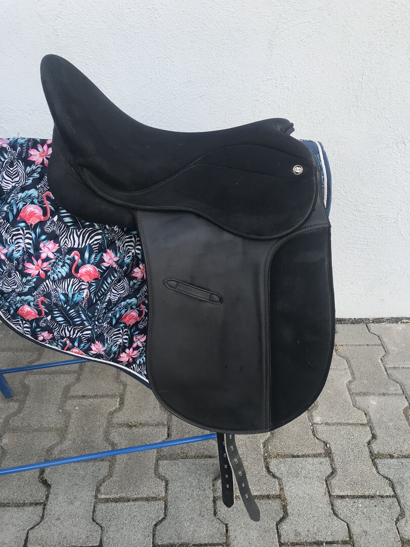 Dressyrsadel SYLKA 16.5 - Elegant och bekväm dressyrsadel i läderimitation. Idealisk sadel för dressyrnybörjare och erfarna ryttare. Sadeln är vadderad med ull och har en utbytbar sadelmage. Det är lätt att byta ut mattaplattan med två skruvar. Sadeln levereras med en vit mattaplatta (fler finns på begäran). Mycket lite använd, inkl. matchande sadelunderlag till salu.