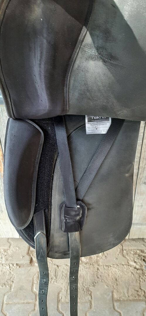 Dressyrsadel Tekna 17,5 - toppskick ! - erbjuder en superlätt dressyrsadel i plast från Tekna med franska paneler, kardborrepaneler och läderremmar.