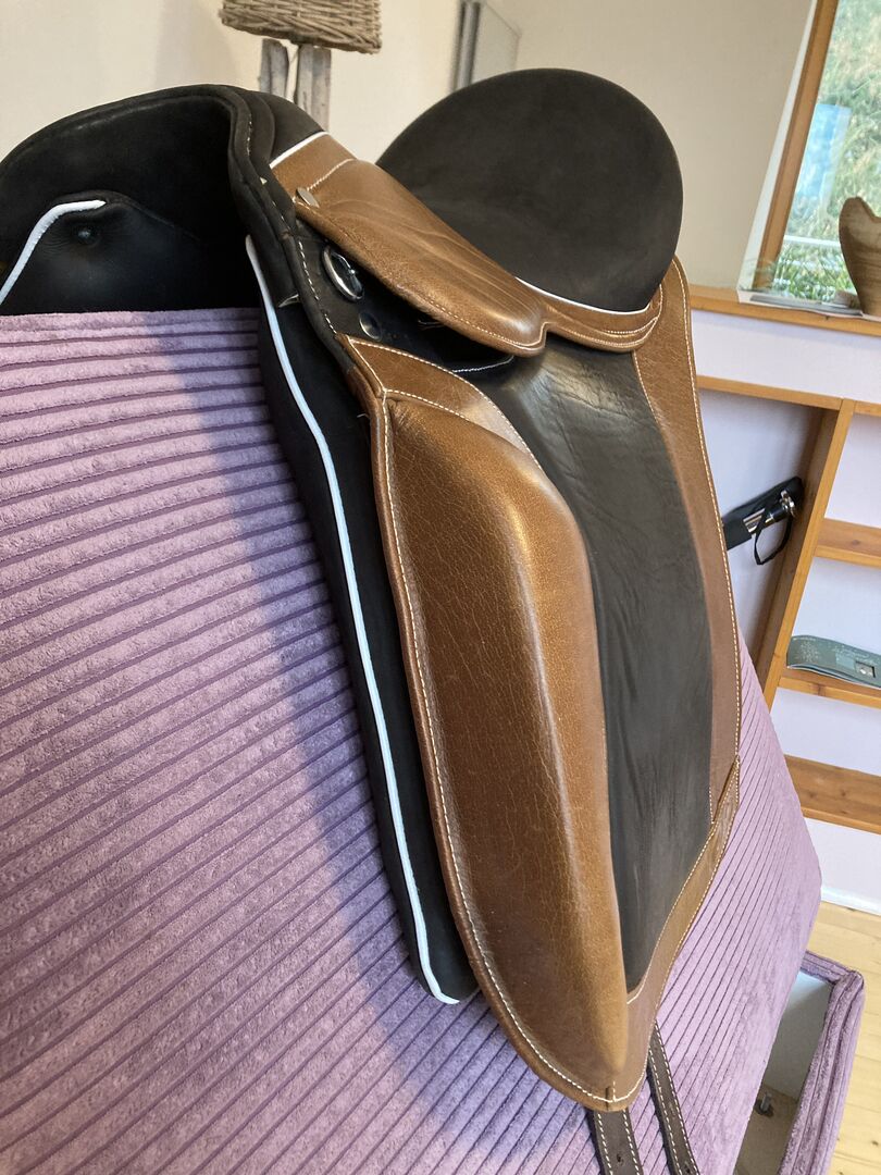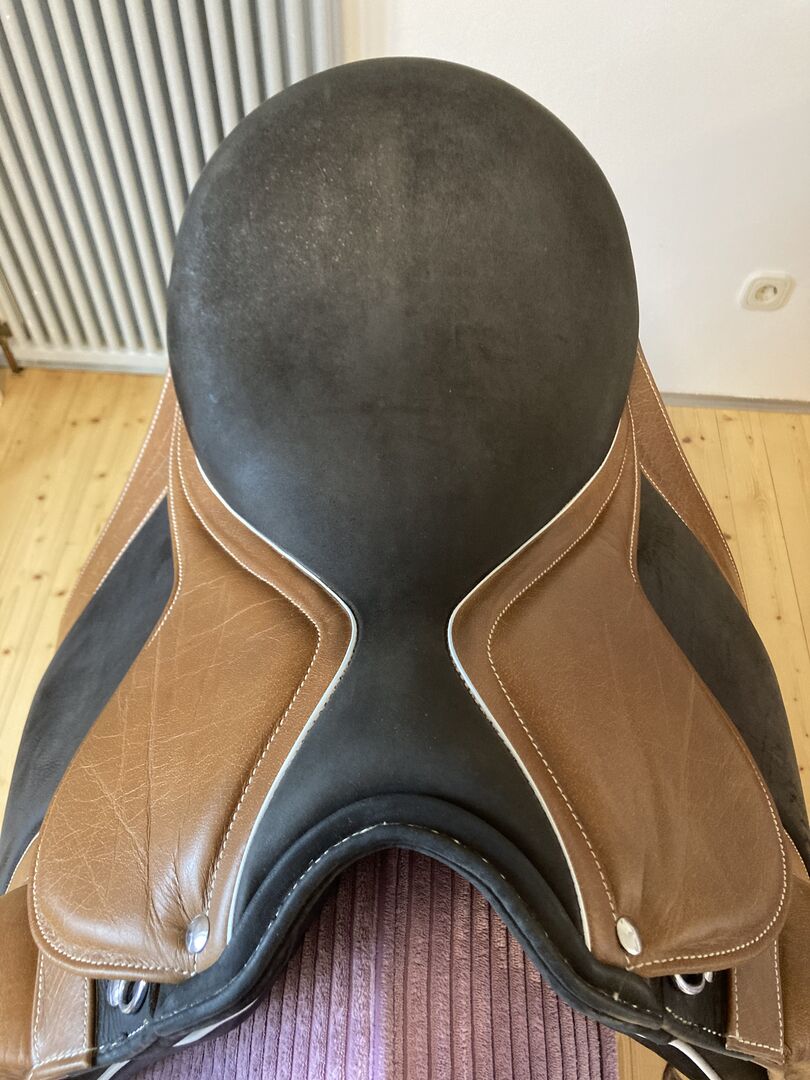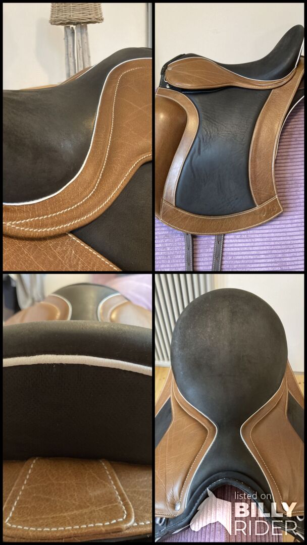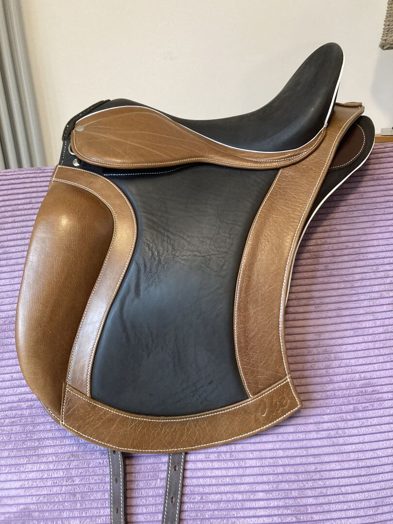 Dressyrsadel, Working Equitation, 17,5 - Till salu är denna vackra och mycket bekväma sadel (även för längre turer). Den har nyligen stoppats om med äkta fårull. Jag säljer den för att mina medryttare (barn) är smalare och vi vill därför byta till kardborreklaffar! Enligt tillverkaren kan denna sadel anpassas till vilken häst som helst! Frakt skulle vara möjligt, men inte för provridning. Provridning är möjlig mot deposition av köpeskillingen!