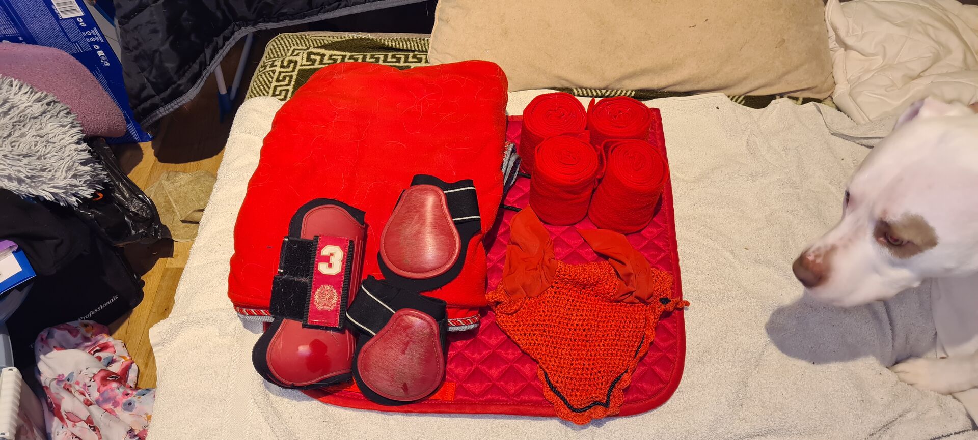 Dressyrset WB/DL - Hej, Jag skulle vilja sälja mitt röda dressyrset, eftersom jag tyvärr inte alls gillar det på mitt sto. Setet består av: - Sadelunderlag WB/DL - Flyghuvud WB - Bandage WB - Gaiters fram och bak WB - Svettmatta 145
