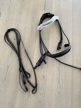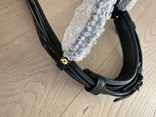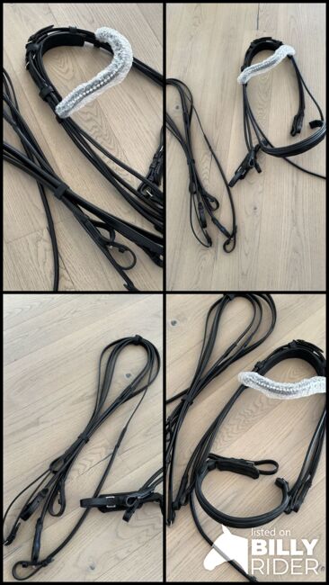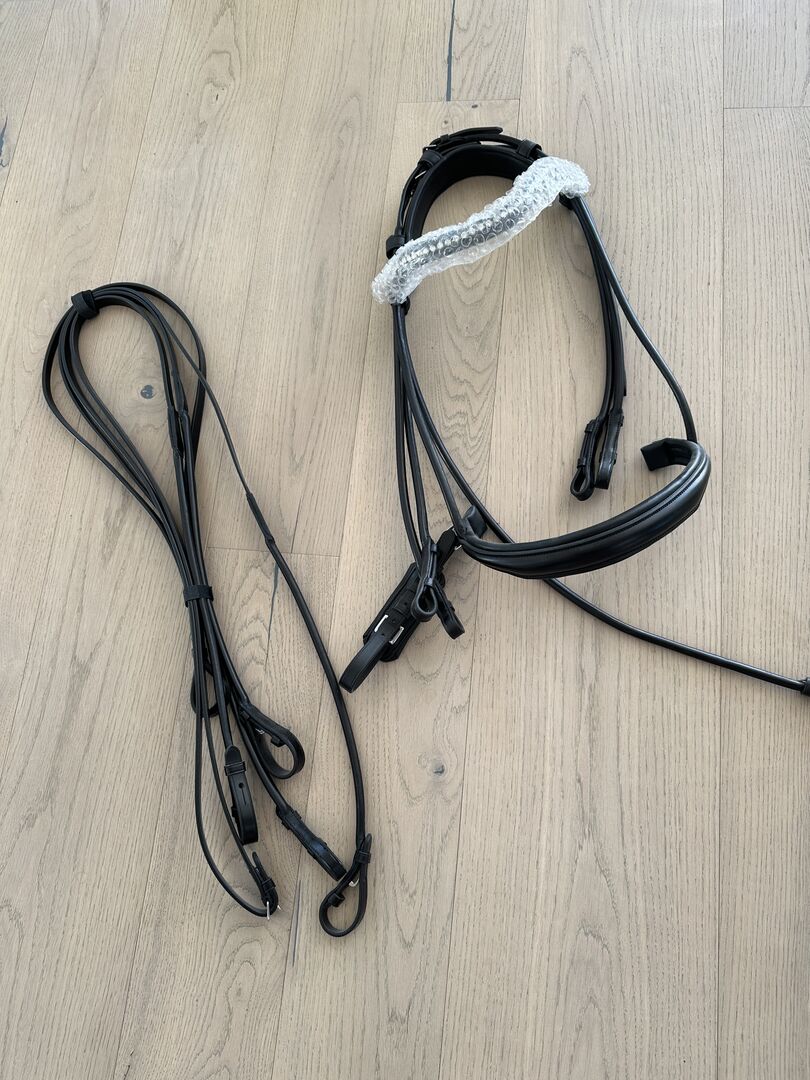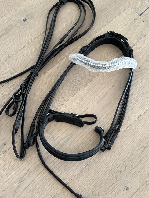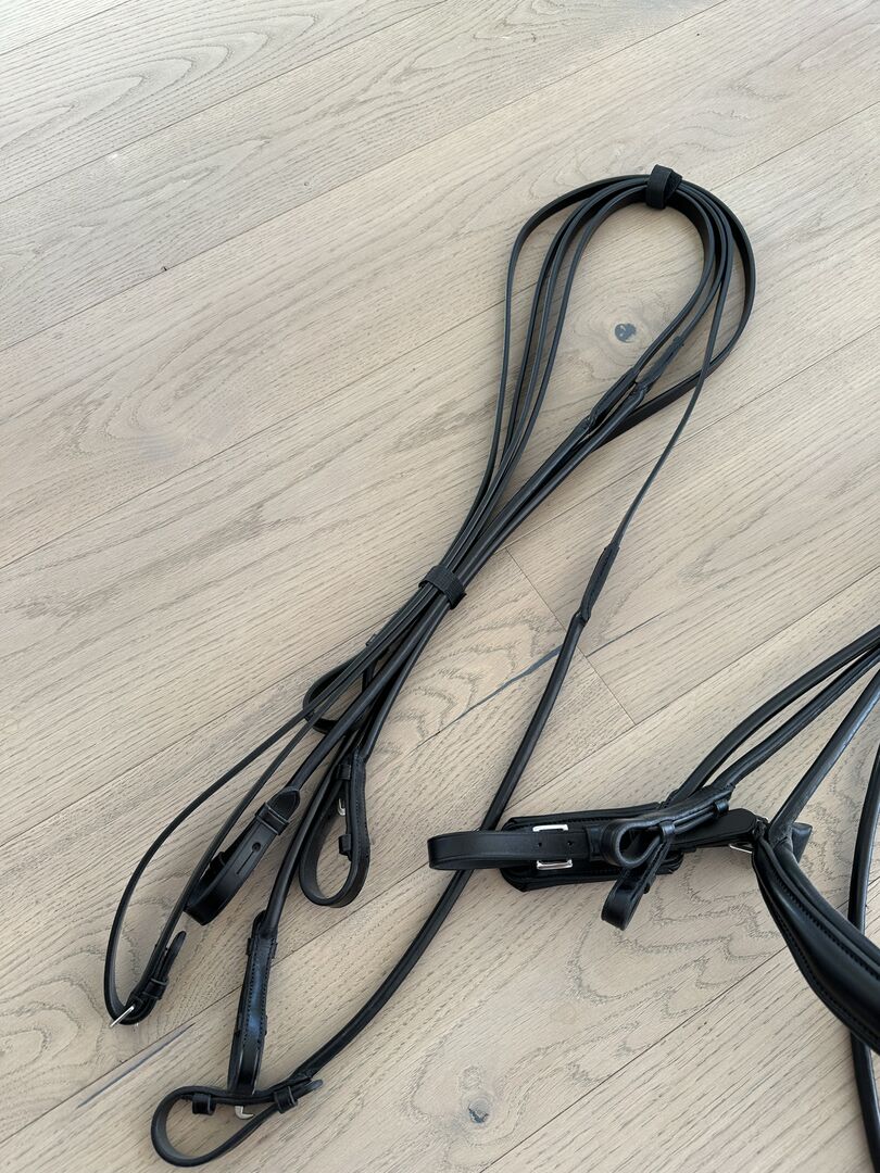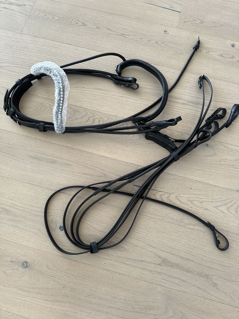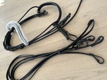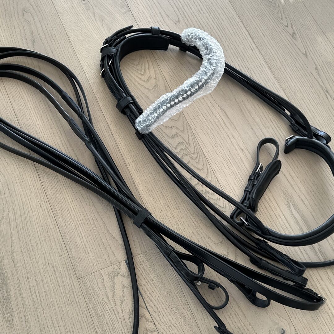 Dubbelt träns kandarbett rundsytt nytt Waldhausen WB svart - Mycket fint helt nytt kandarbett med tyglar och glittrande pannband i äkta läder till salu till ett mycket förmånligt pris.