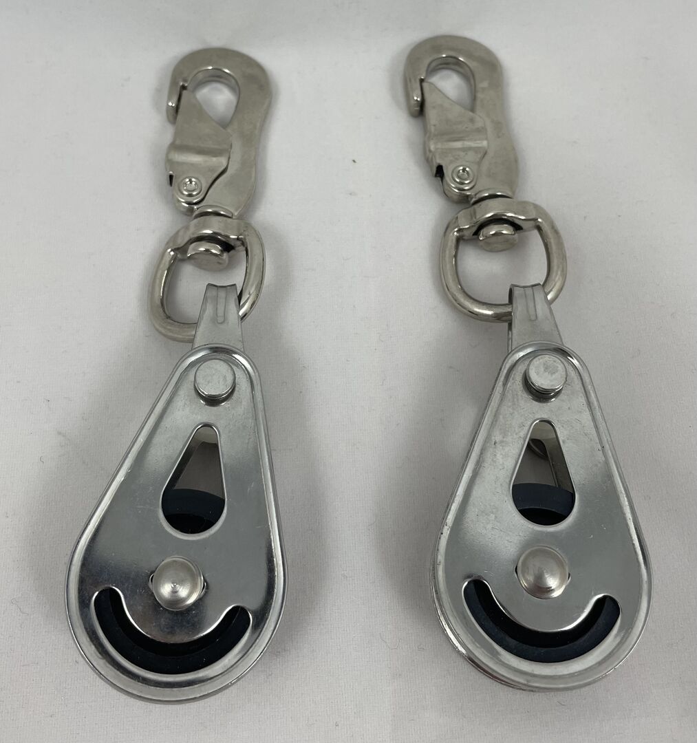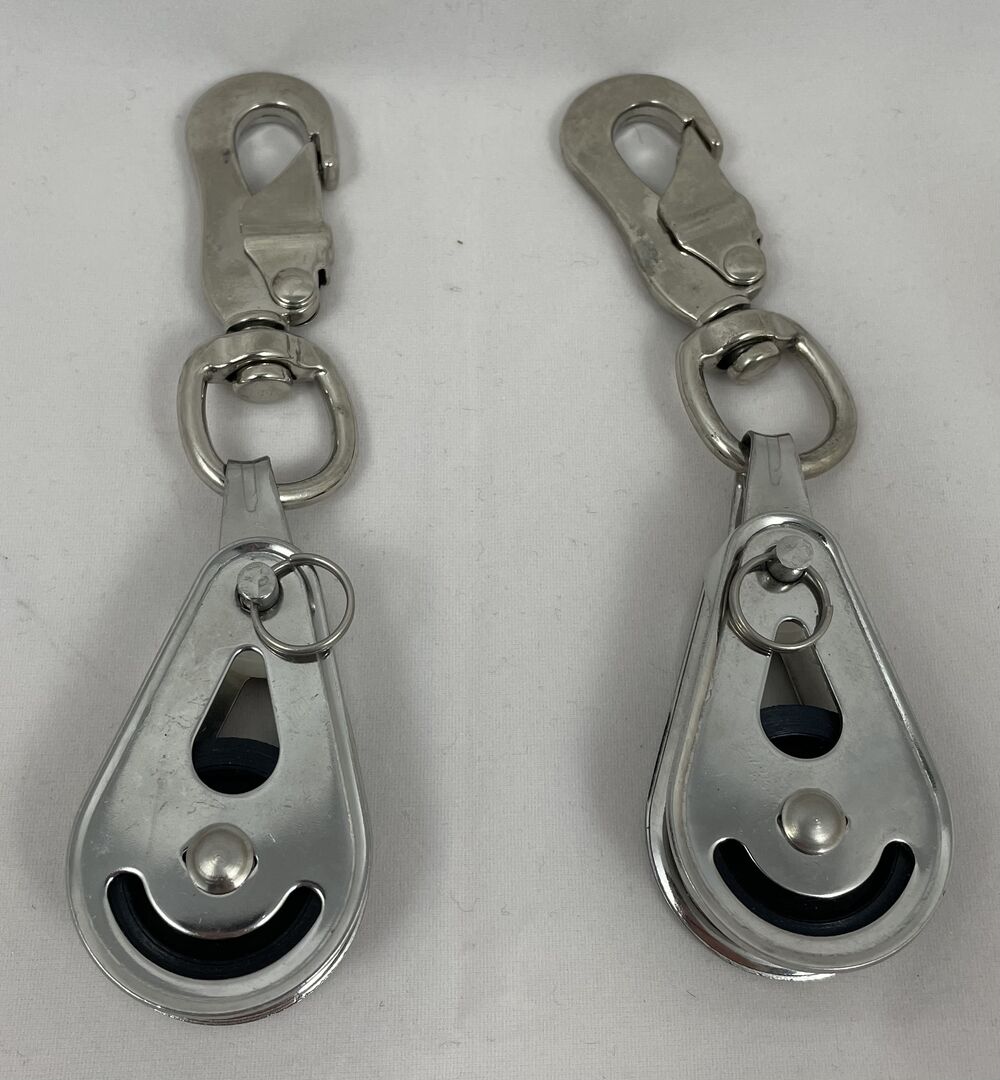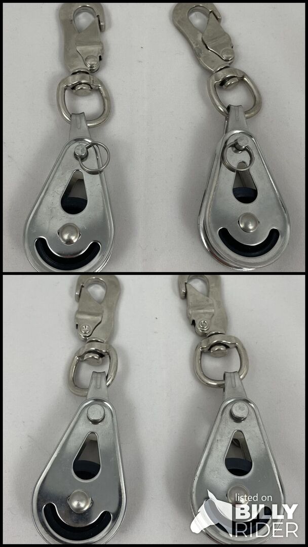 Dubbla pulleys med karbinhake - Dubbel linskiva med karbinhake, lämplig för linor med en diameter på ca 10 mm. Inkl. karbinhake för att enkelt fästa på lunge bandet. Material: rostfritt stål. Mycket sällan använt, knappt några tecken på användning (se bilder).