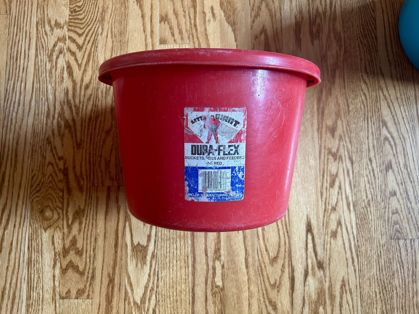 Duraflex Buckets have approximate volume of 8 or 9 L Pre-owned in good condition, clean Total of 4 buckets available at $5 each Buckets can be used for feed, cleaning, carrying supplies, gardening Colours- Red-2 Pink-1 Blue-1