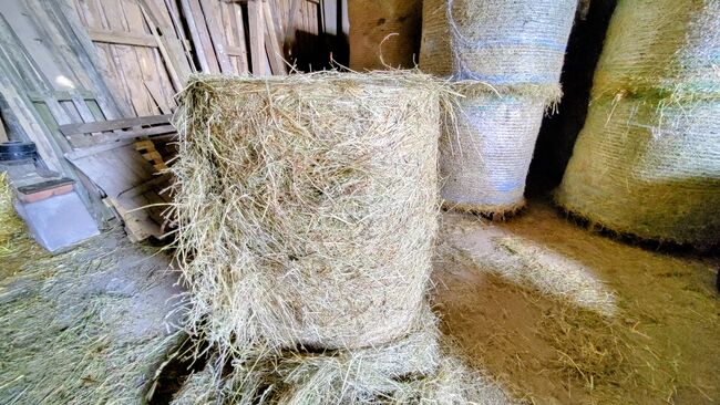 Ekologiskt hö i rundbalar, lagrat i lador, rik på struktur
