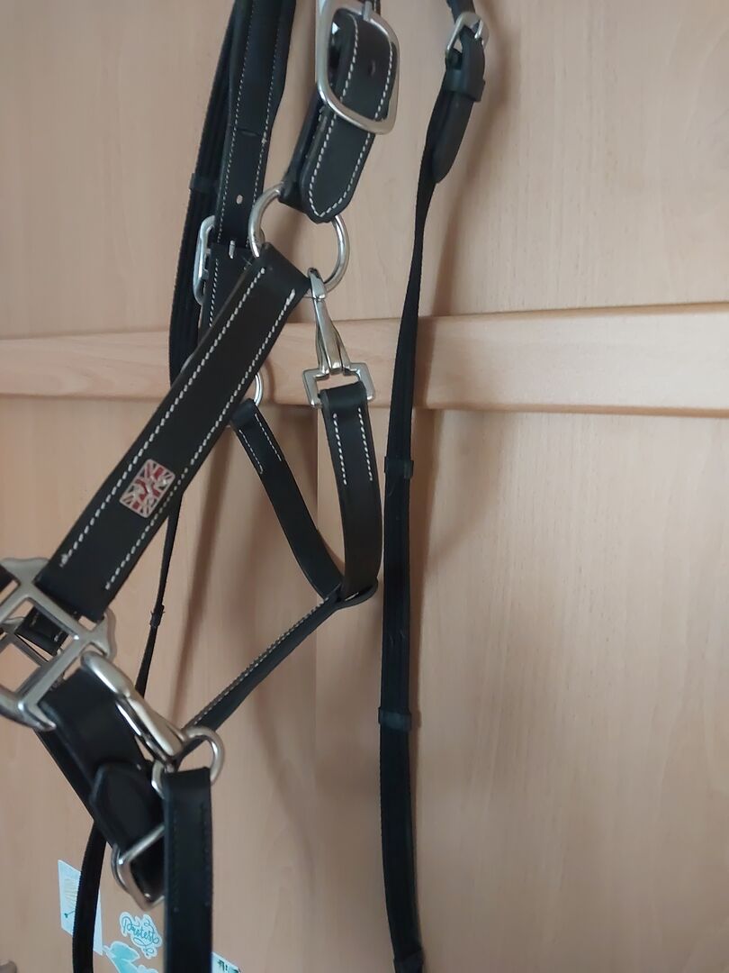 Elegant nosgrimma i läder - 45 Euro inkl. frakt fast pris Storlek Full/ Varmblod Ny utan defekter Elegant, klassisk lädergrimma med gräddfärgade dekorsömmar. Den mjuka lädervadderingen på huvudstycket och nosgrimman ger maximal komfort. Kan justeras två gånger vid huvudstycket och enkelt vid hakremmen. Med silverfärgade beslag.