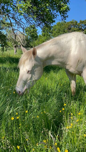 En dröm i rökig kräm - Plats: 06618 Naumburg Jack Pine Forever - en frisk, välbyggd Paint Horse-valack, född den 31 mars 2023, i en sällsynt rökig krämfärgad solid färg med två ljusblå ögon - ett riktigt blickfång! Med en nuvarande längd på ca 147 cm är han harmoniskt musklad, robust och perfekt proportionerad. Hans karaktär gör honom till något mycket speciellt: tillitsfull, gosig och människoorienterad, han är vänlig och villig att lära sig från början. Han är väluppfostrad, okomplicerad och uppmärksam, känner till besök hos veterinären och hovslagaren, avmaskas regelbundet och är mycket bekant med öppen stallning och bete. Jack Pine Forever har redan föl-ABC och är noggrant longerad, vilket gör honom idealisk som en ung häst för självträning. Hans solida allroundstamtavla, 5-panel n/n genom sina föräldrar och fullständiga Paint Horse-papper gör honom till en mångsidig fritidspartner som senare kommer att ge nöje inom många områden. Denna coola unghäst kombinerar sundhet, karaktär och skönhet - perfekt för alla som letar efter en pålitlig, villig att lära sig och iögonfallande häst. Jack Pine Forever väntar på att få växa och glänsa tillsammans med sin nya ägare!