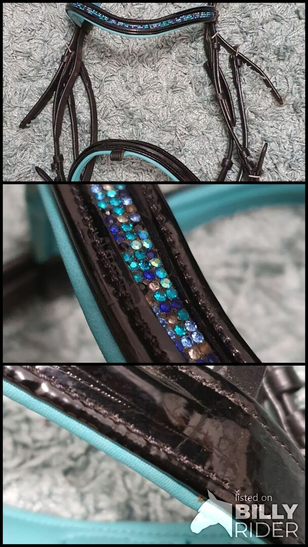 Engelsk kombinerad sadelgjord - Engelska kombinerade tyglar i lackläder med turkos underlag och vadderad hals, panna och nosband. Bältesremmar och kandarband finns tillgängliga (tyvärr inte med på bilden). Storlek liten häst.