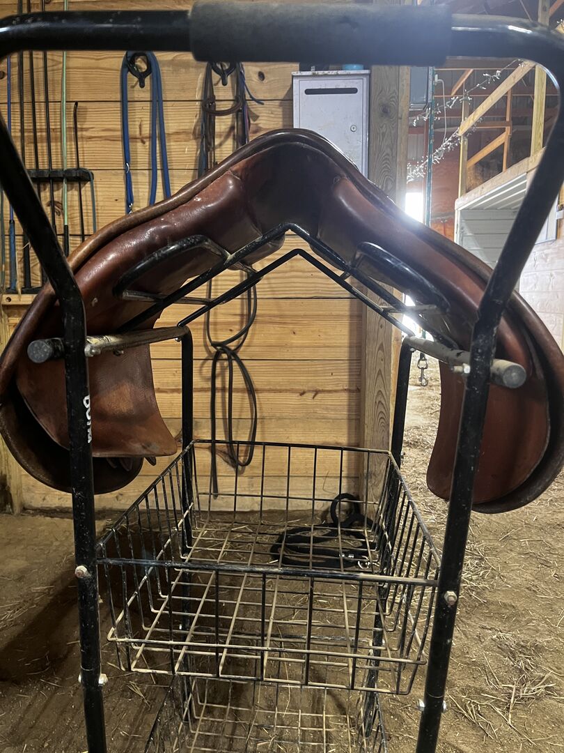 It doesn’t have stirrups, irons or girth. It comes with a English saddle bag.