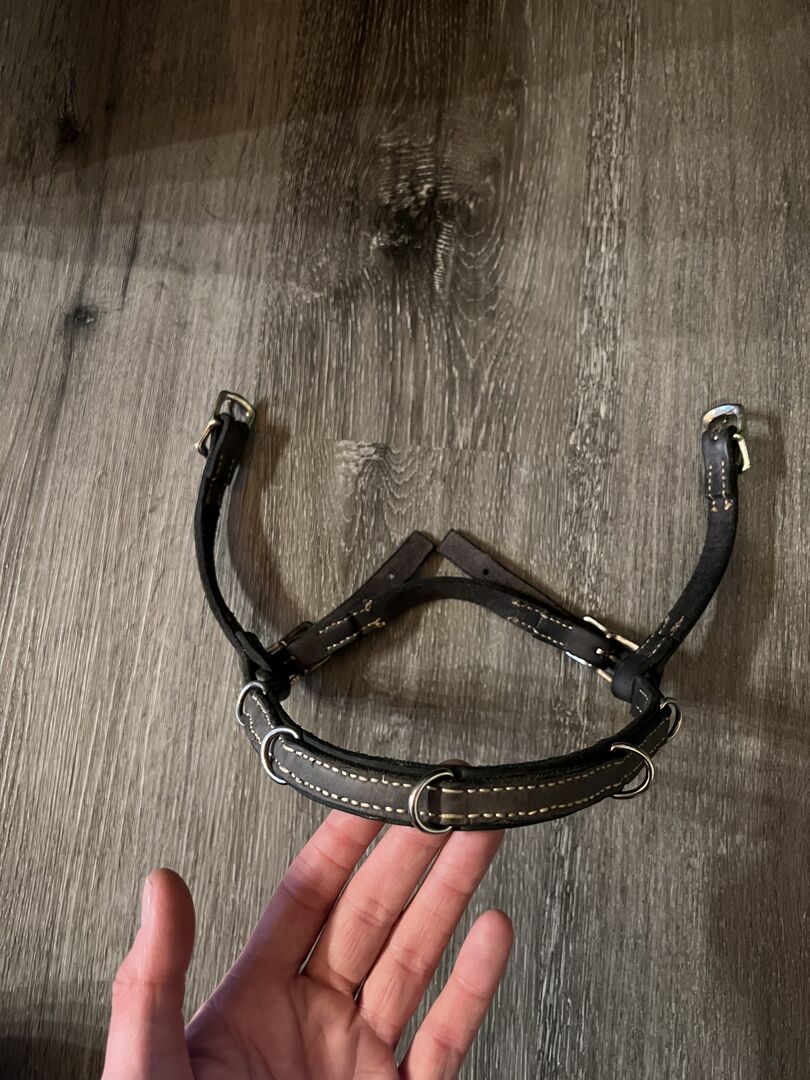 Enörestrygel med kavessonsfunktion Full-XFull/WB-KB grå - Till salu här ett begagnat men mycket välbevarat träns av gråfettat läder med cavessonfunktion i storlek WB-KB. Lädret är mycket mjukt och tränset är lätt att justera och kan därför anpassas optimalt till många huvuden. Jag hade det på en 1,72 m lång Friesian som alltid behöver ett KB-tygel. Jag placerade det ganska centralt, så att det fortfarande finns utrymme att flytta det upp och ner. Man kan också använda tränset helt och hållet som en kandare och knäppa loss kindstyckena för bettet. Kappsäcken är fodrad med mörkgrönt läder.