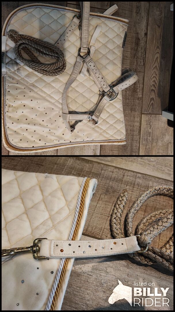 EQUEST DR Saddle Pad med halter och rep - Begagnad sadelunderlag med matchande halster i mocka och ledarrep. Det finns spår av användning, men bara på insidan av halstret och repet har nästan inga spår av användning. Produkterna kan också köpas separat. Kontakta mig om du har några frågor ♥️