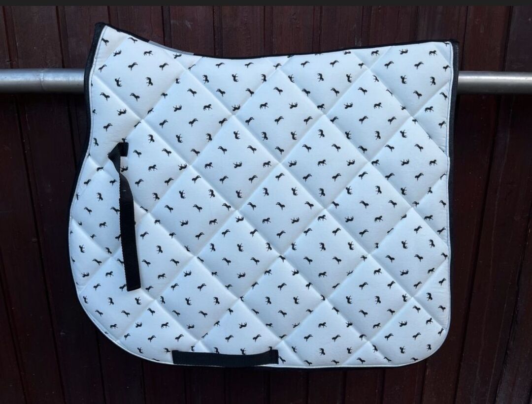 EQUEST Saddle Pad - VS/WB/Full - vit - Erbjuder ett vackert och tjockt vadderat sadelunderlag från EQUEST, undersidan helt i vitt. Storlek VS - WB / Full Vit färg med små svarta hästar och snöre i silver.