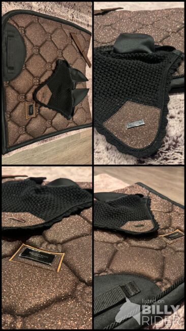 Equestrian Stockholm Glimmer Mahogny - Equestrian Stockholm Schabrakset i färgen Mica Mahogany Full är i nyskick. Schabraket är dekorerat med ett glänsande material och har en anatomiskt formad rygglinje. Setet innehåller en schabrakkudde och en flughuv, som är perfekt matchade. Varumärket Equestrian Stockholm står för högkvalitativa och eleganta ridkläder som även används inom professionell sport. Detta sadelunderläggsset är ett riktigt blickfång på varje hästshow och erbjuder samtidigt högsta komfort för hästen.