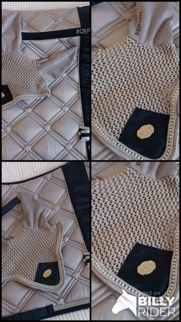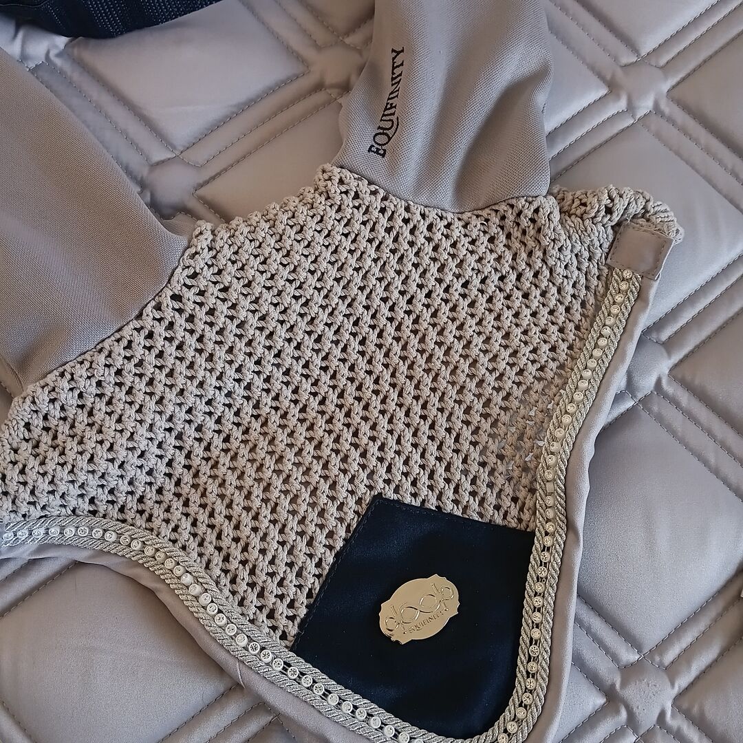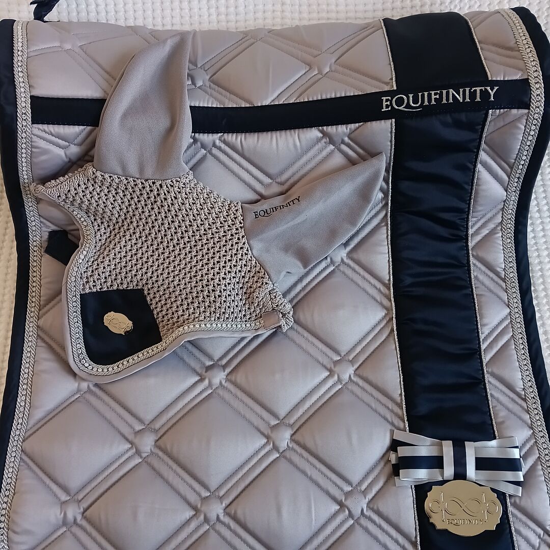 Equifinity sadelunderlägg och flyghätta - Mycket fin sadelkudde med glittrande stenar. Mycket bra för vardagsbruk med kardborreknäppning runt sadelgjordsbanden. Färskt rengjord, mycket lite använd, därför nästan som ny. Matchande flughuv med glittrande stenar. Mycket bra kvalitet. Kan köpas som ett set eller var för sig. Priset är för setet utan leveranskostnader. Jag kan också skicka artiklarna med post, i vilket fall DHL-fraktkostnader skulle läggas till