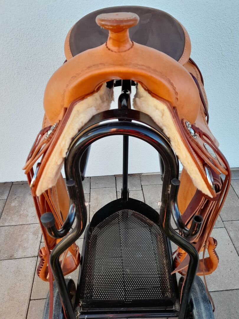 - Färg: honungsoljad, mörkbrun nubuck sits - Sitsstorlek 15,7" - 72 mm träd - Sadelns totala längd: 58 cm - Ladies-version (Ladies Seat) med låg vikt - "Leaves" kantstansning - 6 strängar av slot conchos - Fender med stigbyglar i rät vinkel mot hästen - Stigbyglar med läderflätning - litet hålavstånd i fenderremmarna för mer exakt justering av stigbyglarna dubblerad och med propp - inkl. skyddshölje