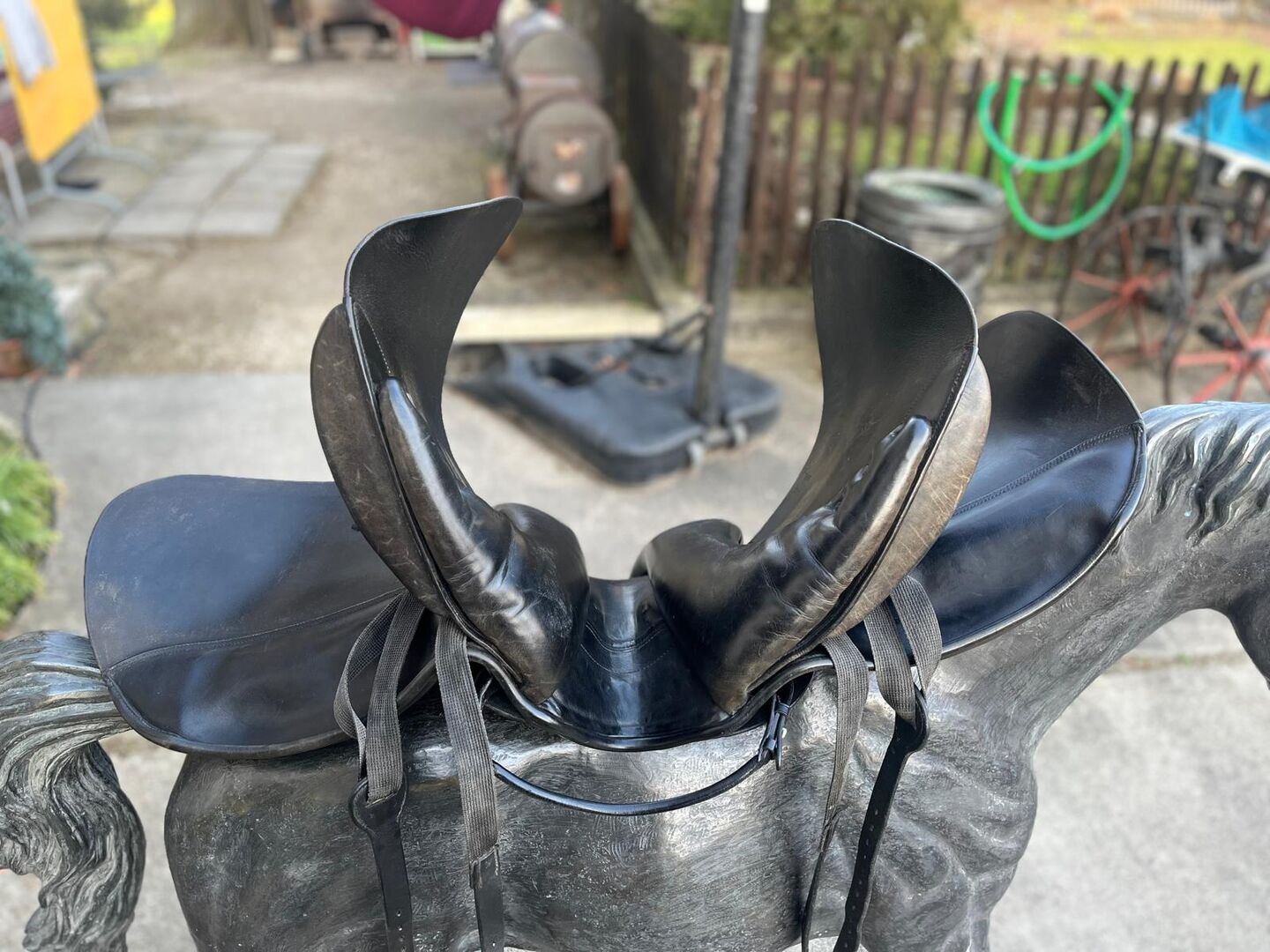 Equinomic dressyrsadel - Equinomic-sadel i svart (sitsen något brunpatinerad). Sittmått ca 17-17,5 cm. Bekväm, välvårdad och idealisk för fritid eller träning. Inga sprickor, mjukt läder. Upphämtning i Barzheim/SH.