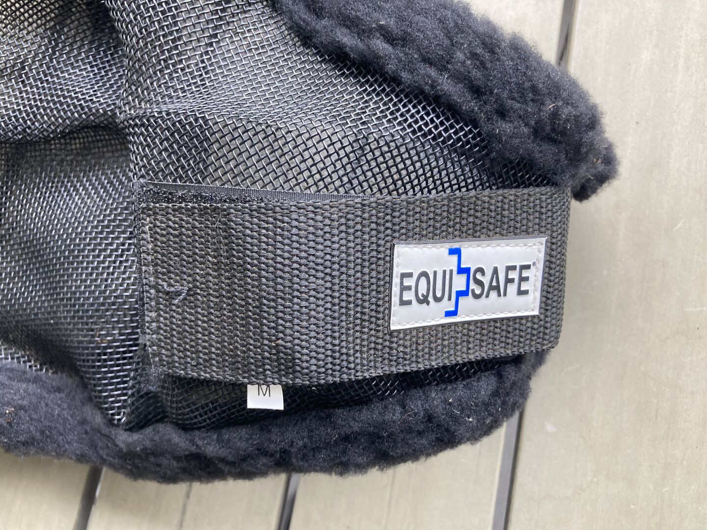 Equisafe flugskyddsmössa flugskyddsmask med öron Gr.M / WB - Flugmask Flughuv svart, mesh, med öron, vadderad med mjuk svart syntetisk päls i kanterna, kardborreknäppning för enkel påtagning. Varumärke : Equisafe Ursprungligt pris : 19,50€ Storlek : M (passar VB och inte för stor WB). Endast använd en gång.