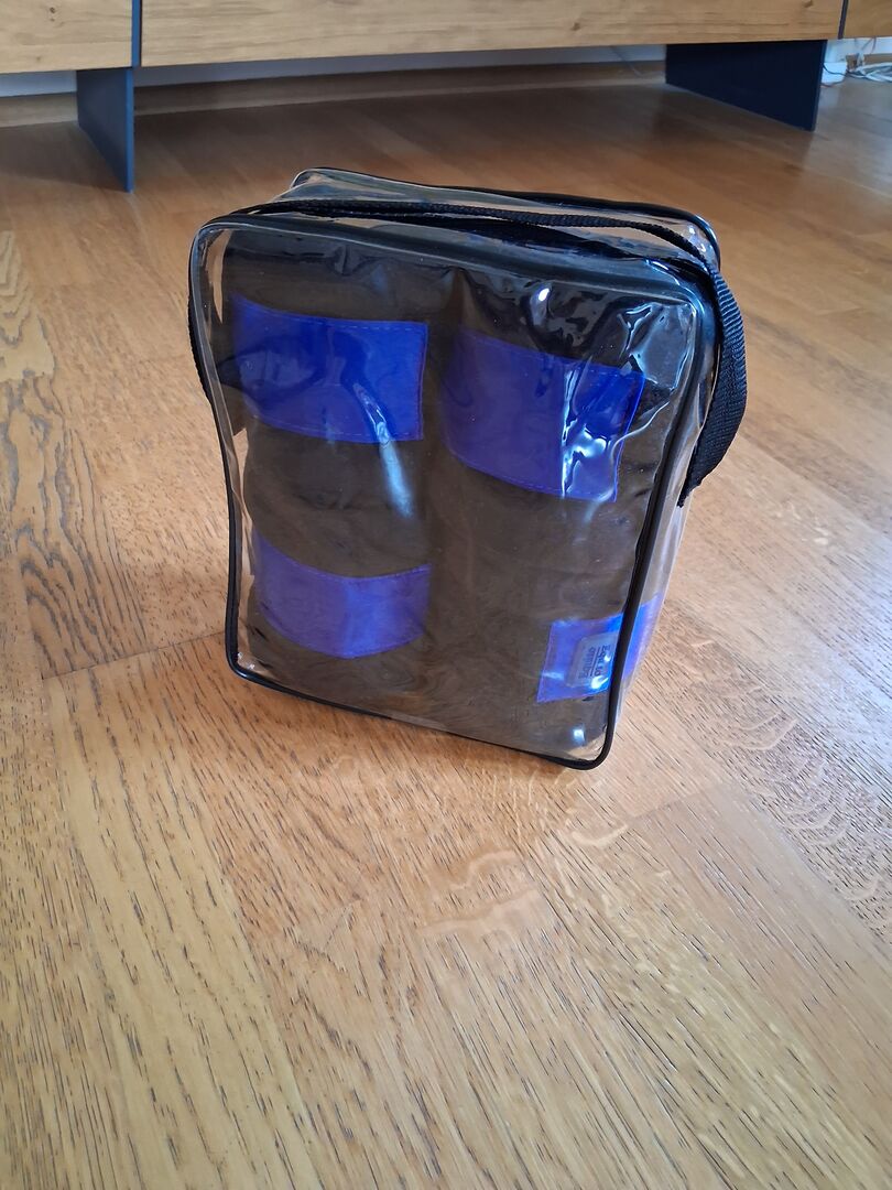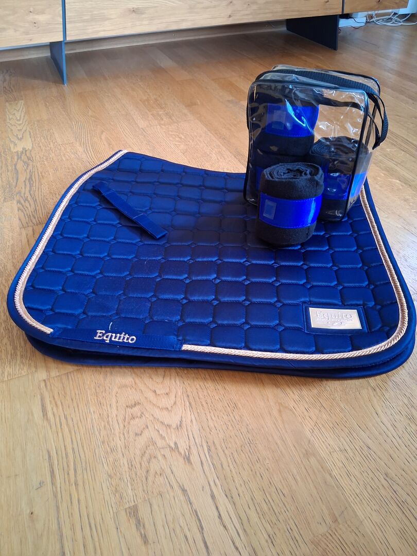 dunkelblaue Schabracke mit rosegoldenem Zierrand aus Kordeln, feines Absteppmuster in quadratform. Passende Bandagen in schwarz mit Klettverschluss im passendem blau. Beide Artikel wie neu.