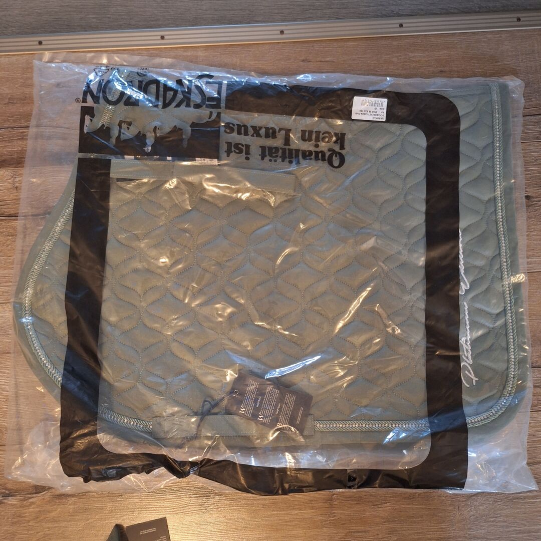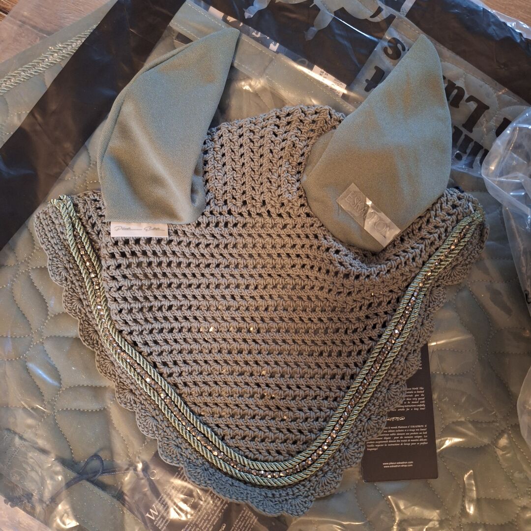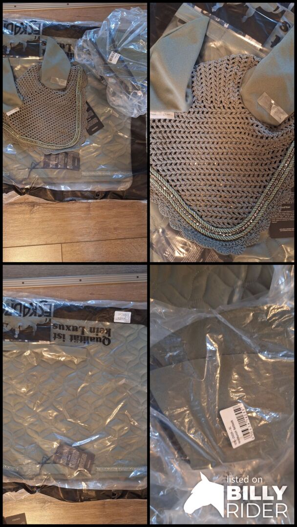 Eskadron Ashgreen schabrack med flyghätta och Horze hovklockor - Till salu denna nya uppsättning bestående av en VS-sadeldyna, en flughuv och Horze hovklockor i XL
