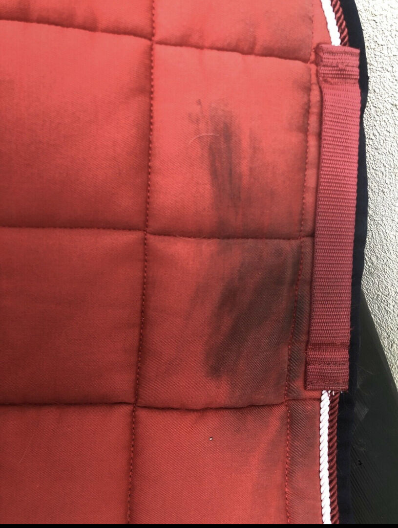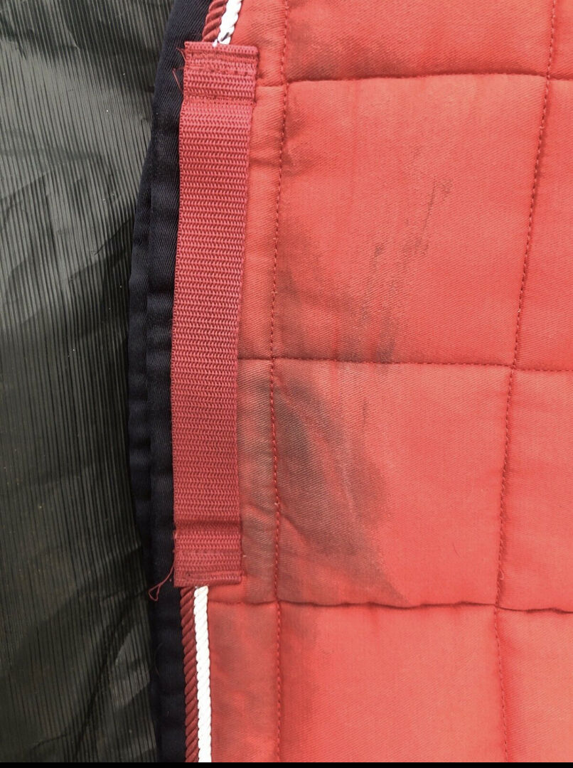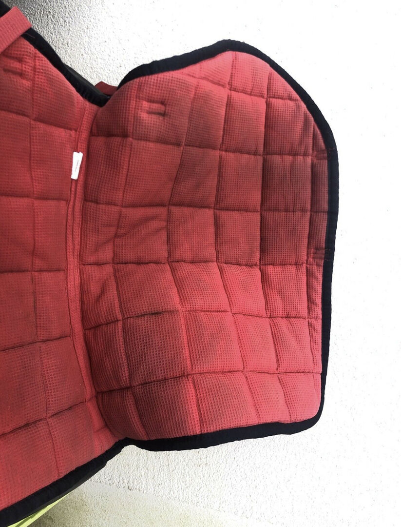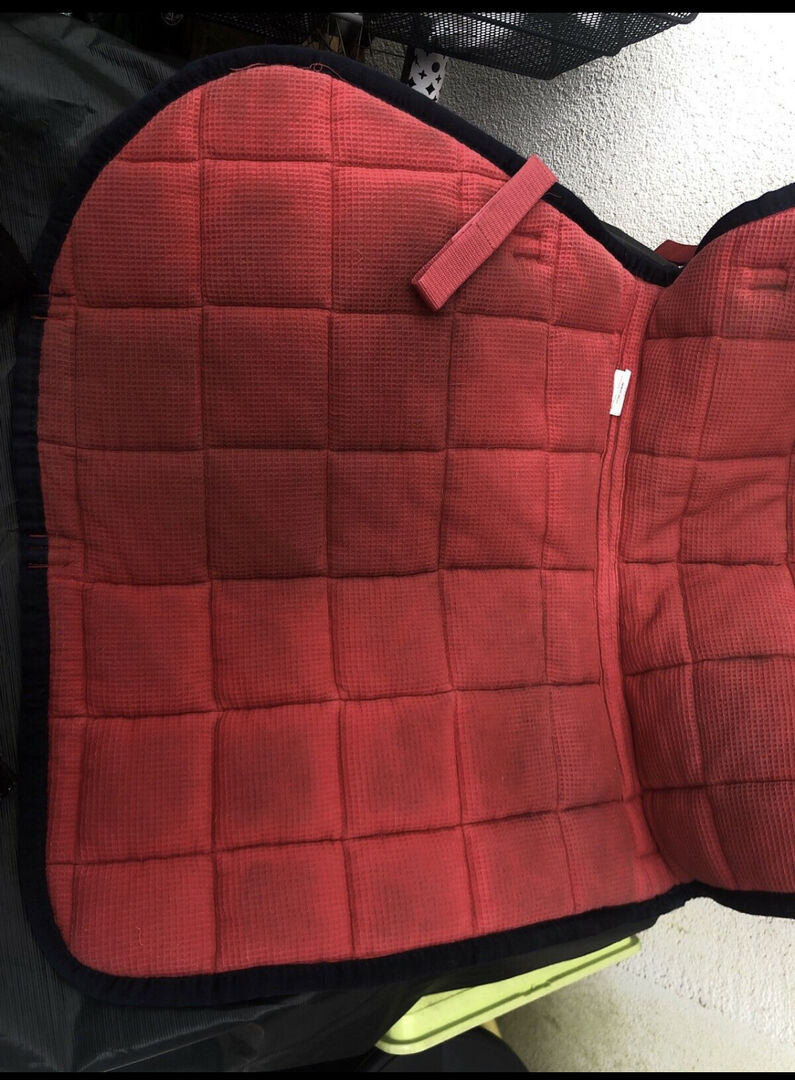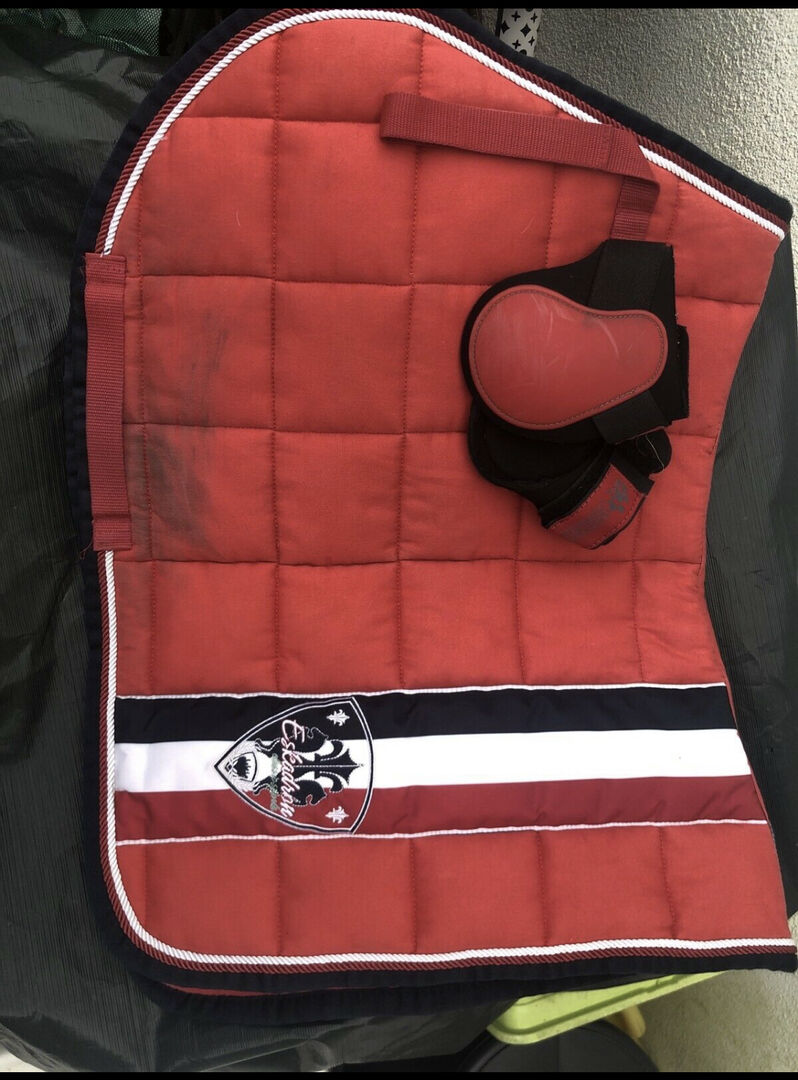 Eskadron big square i rött + 4riders pads - I många år har detta varit min absoluta favoritsadelunderlag, men det var dags att rensa ut det. Sadelunderlaget har alltid varit ett blickfång med sin vackra röda färg. Den visar vissa tecken på användning, men har rengjorts och endast använts på en frisk häst.