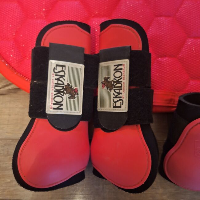 Eskadron Reflexx Pink Set Hoppning - Till salu denna uppsättning bestående av en ny VS-sadeldyna med den en gång använda flybonnet och de högsta 2 gånger använda damaskerna med fetlockstövlar. Gaiters och fetlockstövlar har minimala tecken på slitage på insidan och utsidan. Annars är de som nya.