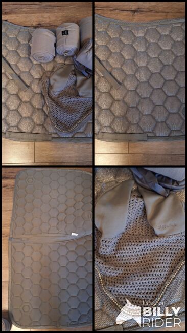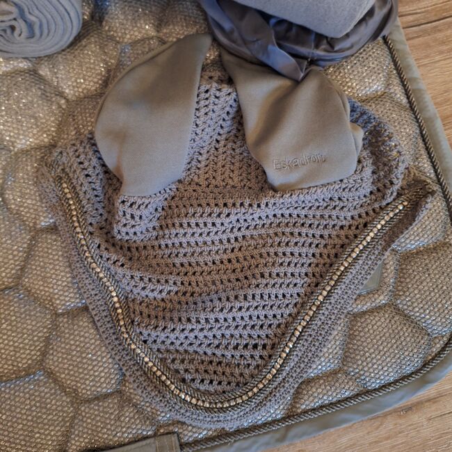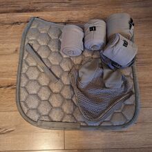 Säljer detta set som bara har använts två gånger som mest. Det består av en dressyrschabrack i glitternät med bandage och flughätta.