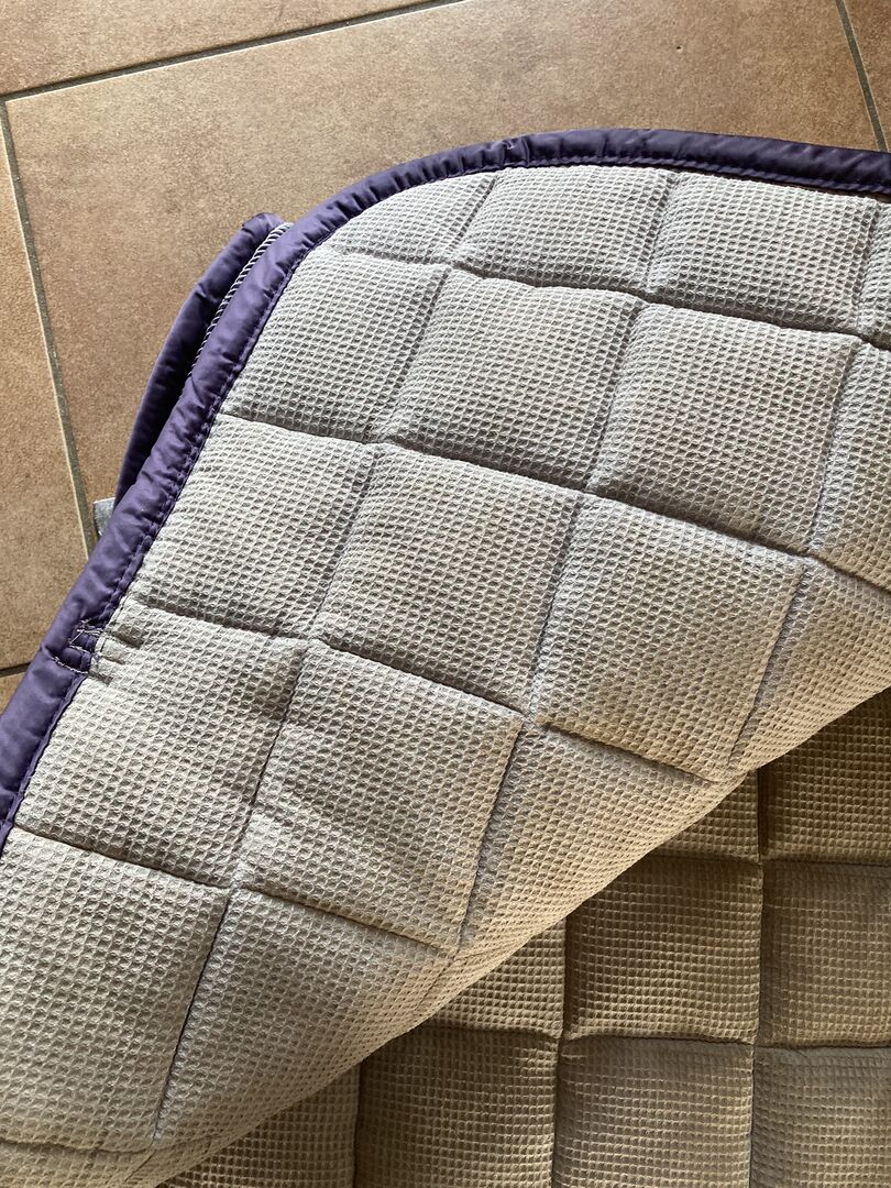 Eskadron Saddle Pad i grått Dressage - Säljer ett välbevarat dressyrsadelunderlag från Eskadron i grått med en lila och vit rand och två fina snören. Se foto. Sadelunderlaget är något tjockare (se foto nr 3). I gott skick med lätta spår av slitage. Nyligen tvättad.