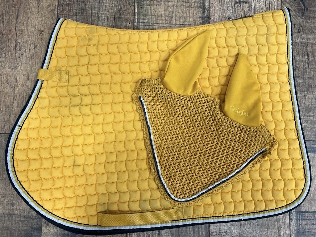 Eskadron sadelskydd + flughuva - Till salu senapsgult schabraket + flughuva i storlek WB
