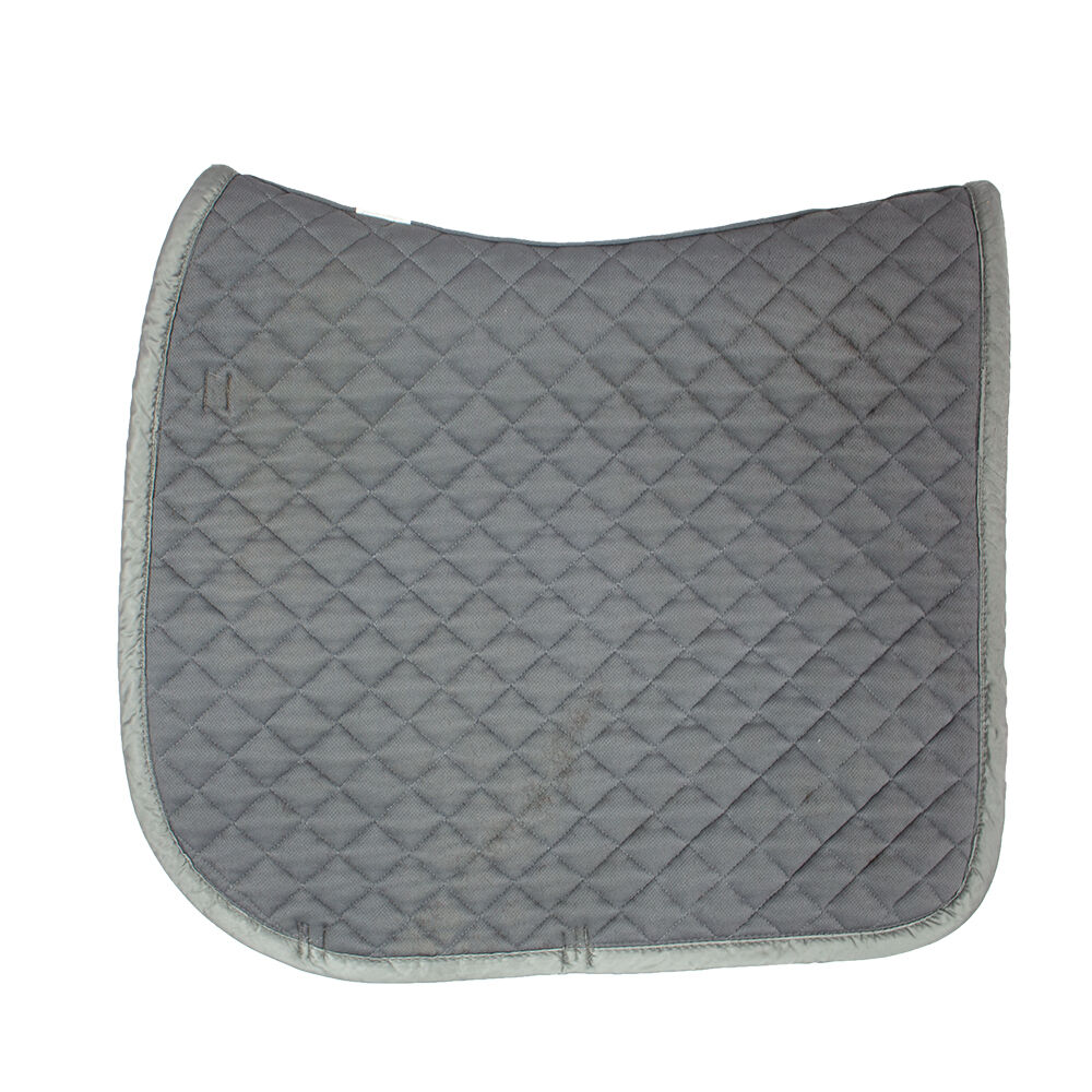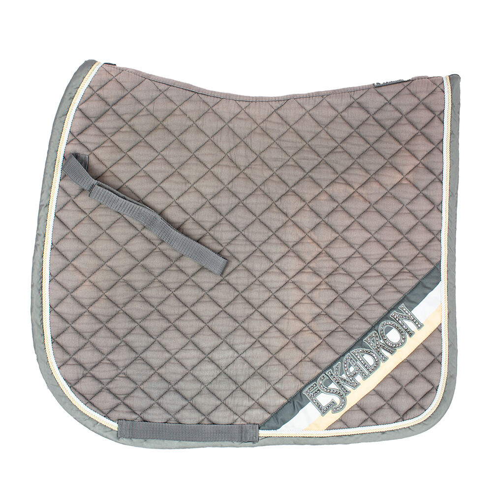 Eskadron sadelunderlag Grå/Banan DR - Ett vackert och högkvalitativt dressyrsadelunderlag från Eskadron. Sadelunderlaget är tillverkat av 100 % bomull och är därför särskilt hudvänligt. Den vackra träningsunderlägget är försett med ett elegant grått band och har vackra ljusgula detaljer samt glittrande stenar som pryder Eskadron-skriften. Den är i gott skick. Det grå tyget är lite urtvättat och har lätta fläckar. To the seller's offerlaunch