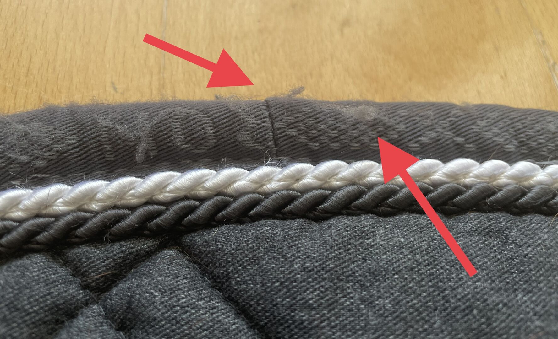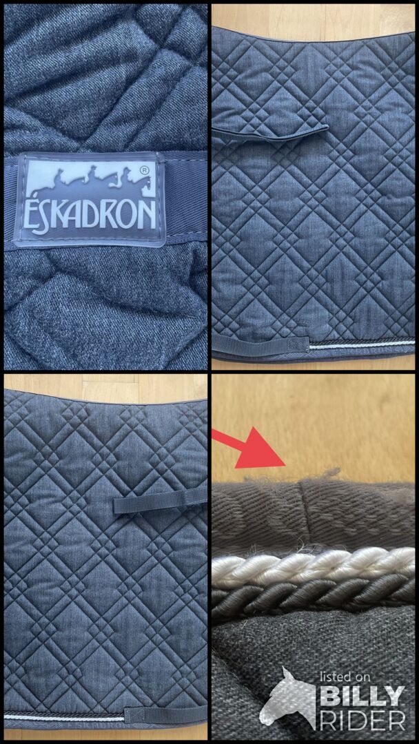 Eskadron Schabrack, WB Dressage, Grå Melange - Till salu ett mycket fint begagnat Eskadron schabrak, storlek varmblod dressyr i den sällsynta färgen grey melange. Exceptionell quiltning, de två panelerna är mörkgrå och vita, den grå kanten innehåller Eskadron-bokstäverna. Schabraket är funktionellt men har små tecken på slitage såsom uppruggade områden på kanterna (se detaljerade foton).