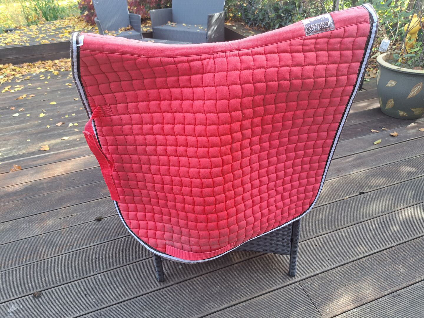 Eskadron schabraket DL i rött - Schabraket har de vanliga skavmärkena från sadeln, men dessa syns inte under en sadel. I övrigt är den i gott skick och har inga skador.