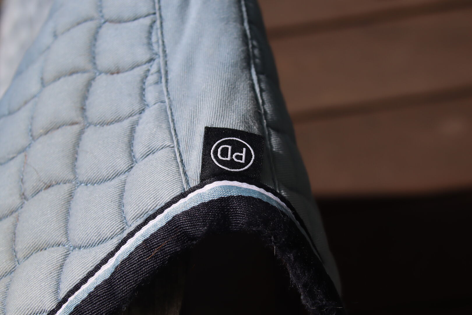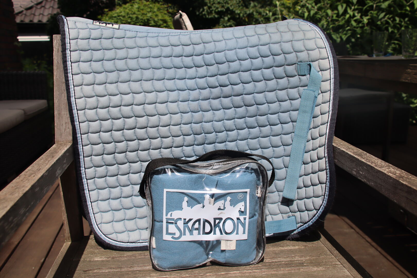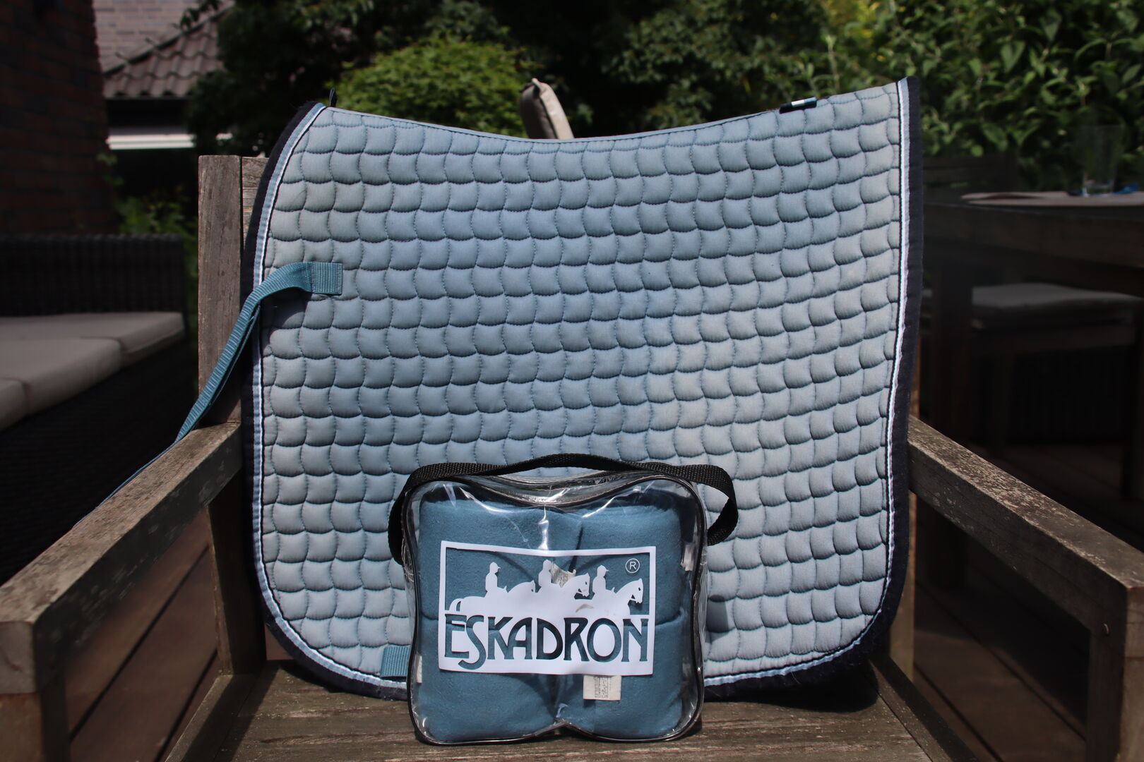 Eskadron Set: Sadelunderlag bomull i PD och bandage i Pony - Jag säljer ett Eskadron ponnyset med sadelunderlag och bandage i samma färg. Sadelunderlaget är lite blekt utanför sadelområdet, vilket inte märks med sadeln på, men har i övrigt inga defekter etc., bandaget ser ut som nytt. Dessutom har föremålen tvättats nyligen.