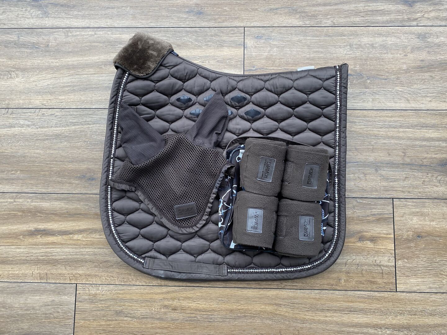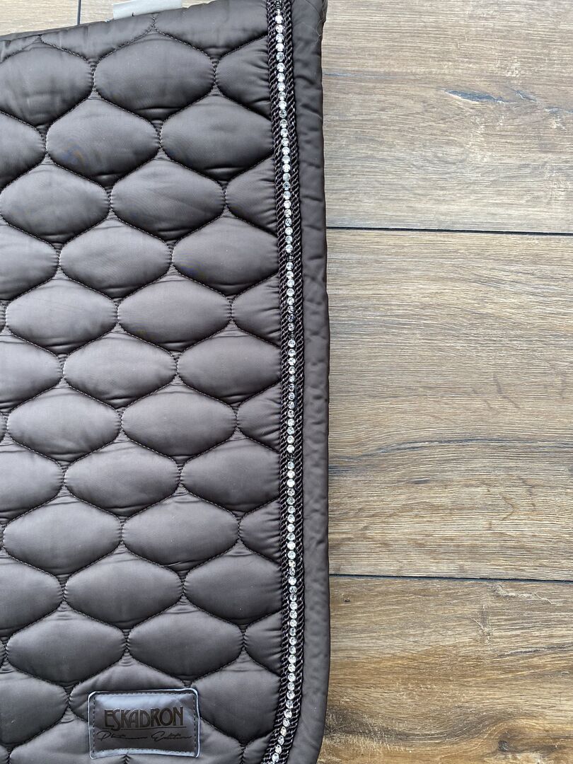 Eskadron set schabrake, flugöron, bandage, WB, DL, mörkbrun - Jag säljer ett vackert set av Eskadron från Platinum Collection 2020 i WB DL, bestående av ett schabrak, blankt mörkbrunt med strasskant, en flughätta och bandage i samma färg.