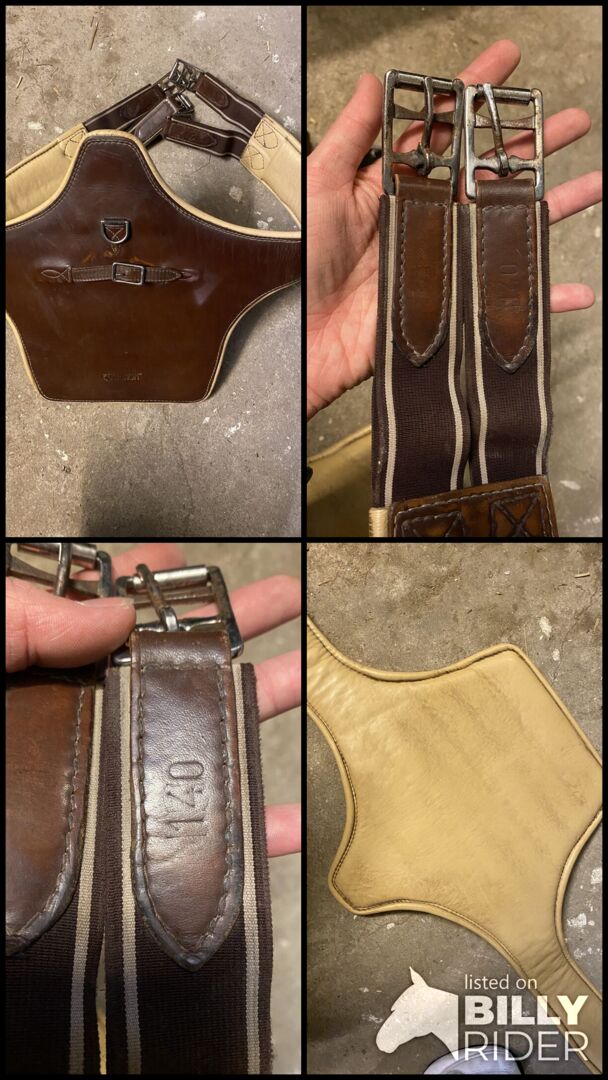 Eskadron Stud Girth Saddle Girth 140 - Säljer en begagnad, men fortfarande i gott skick, spikad sadelgjord från Eskadron i en fin ljusbrun/cognacfärgad ton. Lädret är mjukt och har inga sköra fläckar eller sprickor. Det finns normala användningsspår på lädret. De elastiska insatserna finns på båda sidor och är fortfarande fina och täta och inte slitna. Tyvärr har spännena en del rost, så jag har redan tagit över bältet, men de rör sig fortfarande smidigt. Det är alltså bara ett visuellt fel.