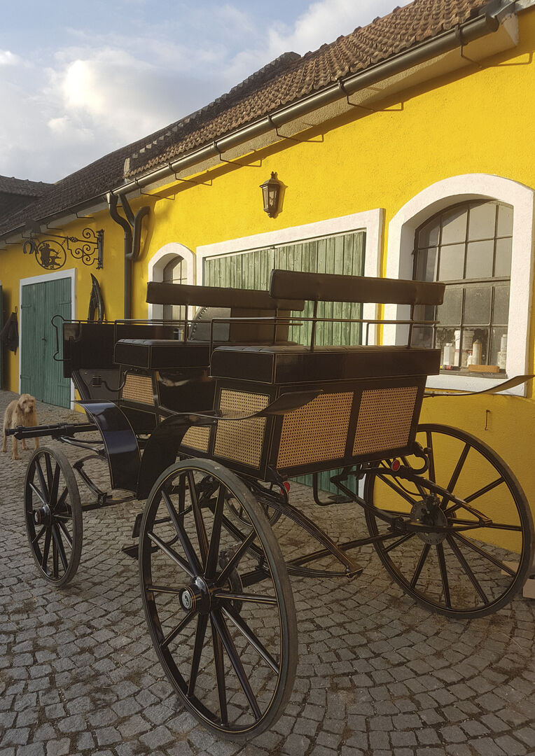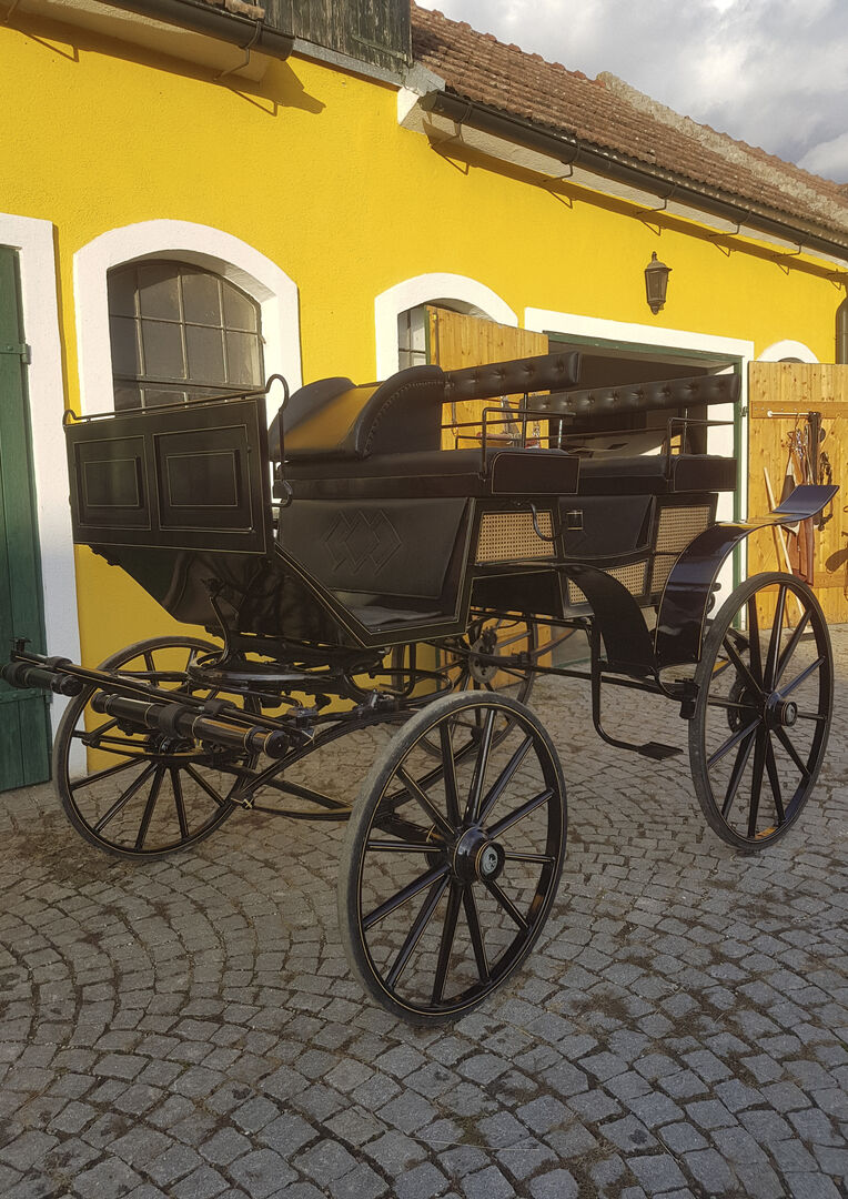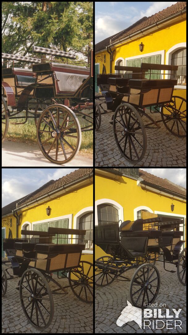 Esterhazy jaktvagn - Till salu lite begagnad Esterhazy jaktvagn, 4-sitsig, bockhöjd 140 cm. Stålhjul med koniska, ovala ekrar, massiva gummidäck, skivbromsar bak. Hjulstorlek 110 och 90 cm. Utrustning för enkel- och dubbelvagn ingår. Spårbredd 148 cm.