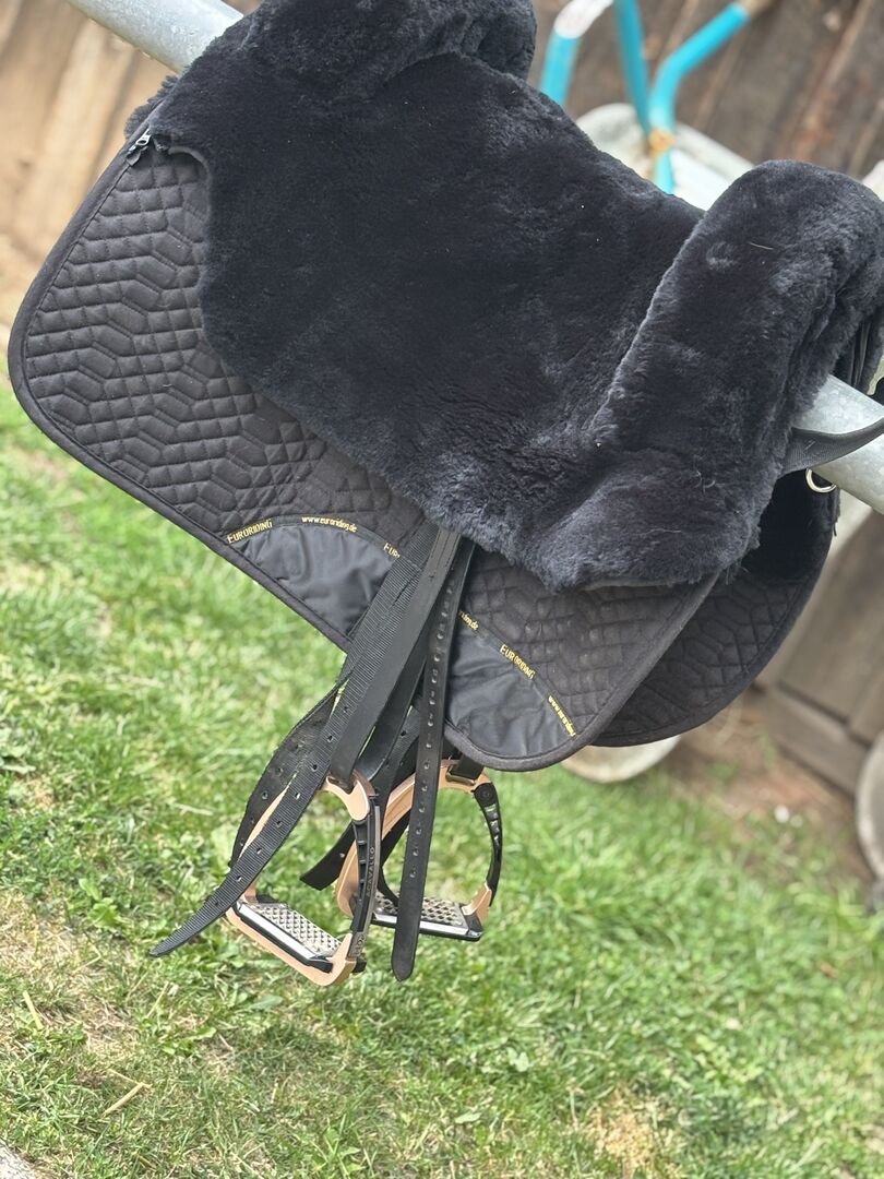 Euroriding skinnsadel som ny - Vi säljer vår nya pälssadel som vi köpte till vårt mule sto. Hon rider nu genom bergen som resande dam och behöver inte längre denna superbekväma skinnsadel. Stigbyglarna kan köpas till mot en extra kostnad - men ingår inte.