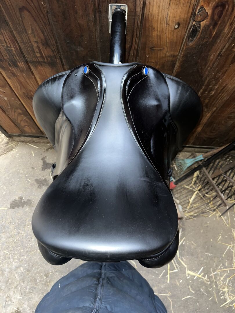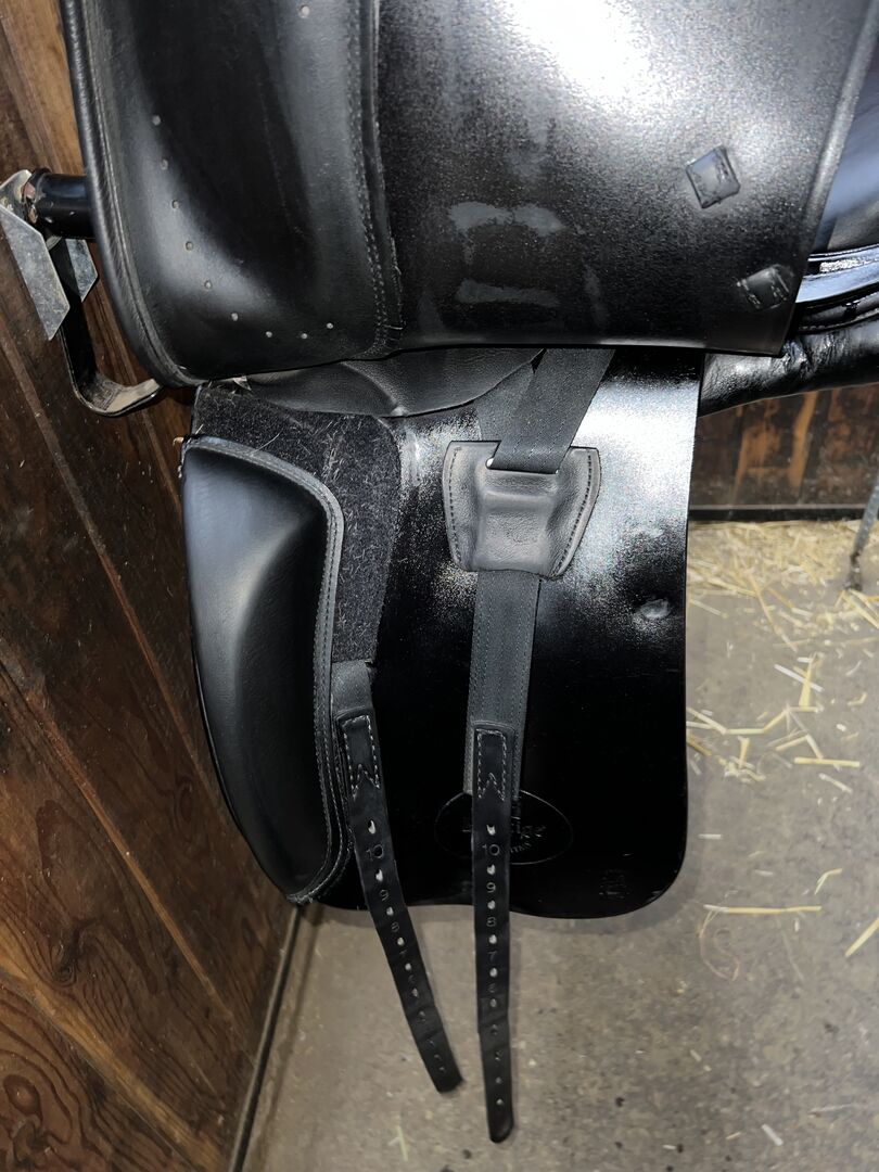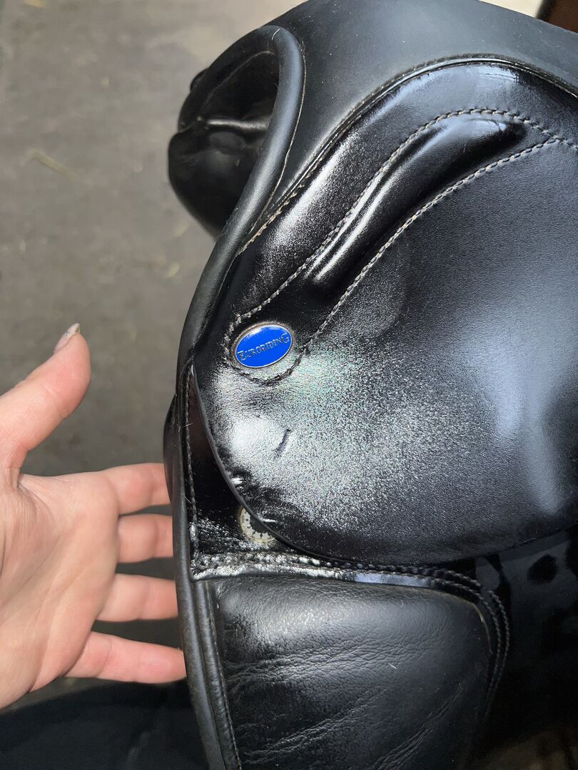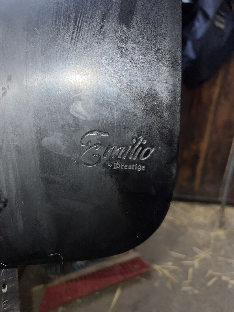 Euroriding x Prestige Emilio dressyrsadel 17,5 - Hej på er alla, Jag säljer min välskötta dressyrsadel med kardborreblock. Sadeln har alltid förvarats torrt och väl omhändertagen. Tecken på användning kan ses på bilderna. I övrigt är sadeln i mycket gott skick. Sadeln är nyoljad på bilderna, annars kan man inte se slitaget från stigbygelns läder. Den enda "fläcken" kan ses på den sista bilden. Den är bara mycket liten och har ingen skadlig effekt. Jag säljer den eftersom den tyvärr inte passar min häst perfekt.