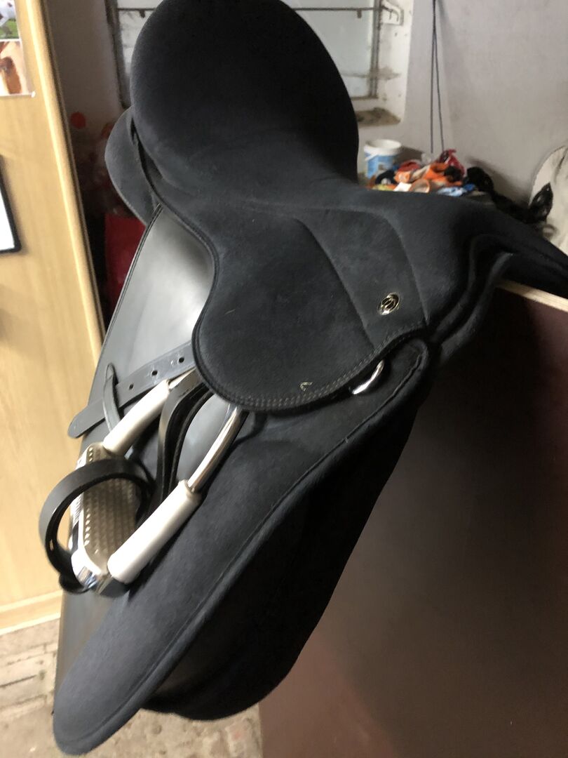 Evenemangssadel 16,5 tum - Begagnad eventing sadel i 16,5 tum. Vid behov även med skydd för bältesremmar, stigbygelremmar och stigbyglar. Sadeln har inte använts ofta och har varit välskött. Magsäcksplattan är 30 cm bred och 5 cm bred på baksidan av virvelkanalen.