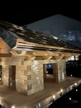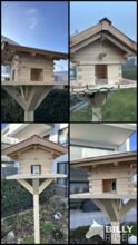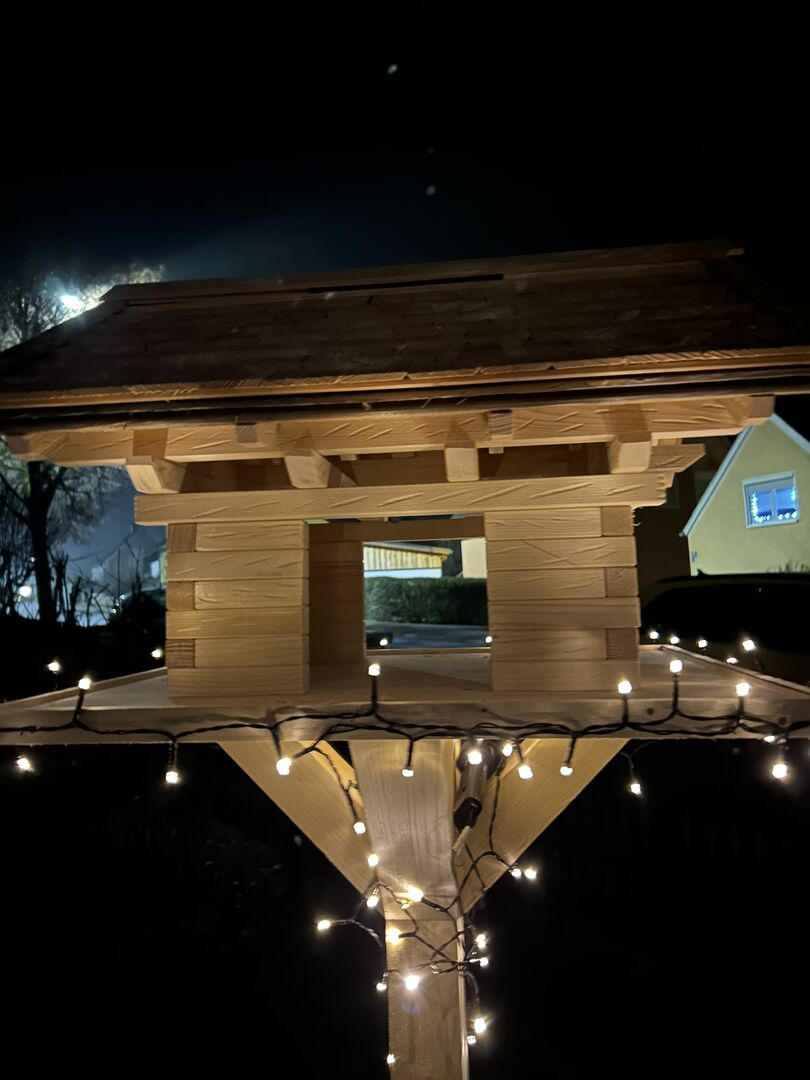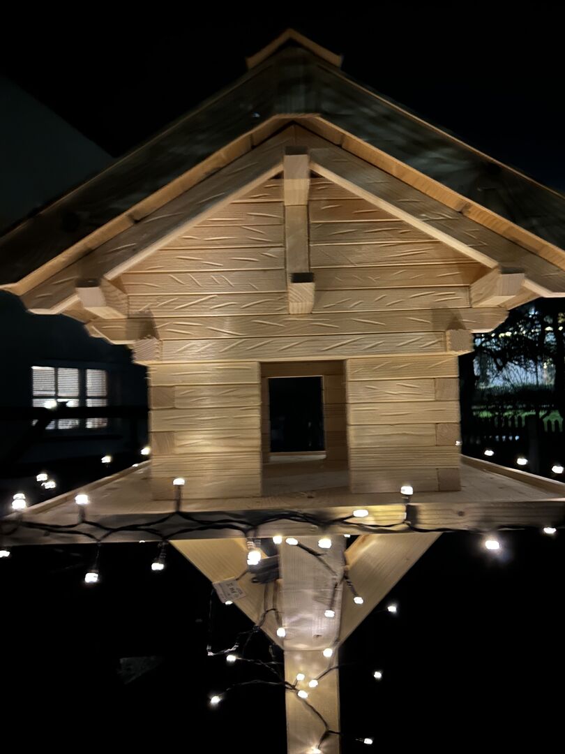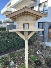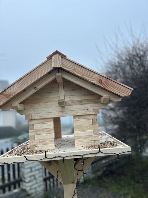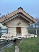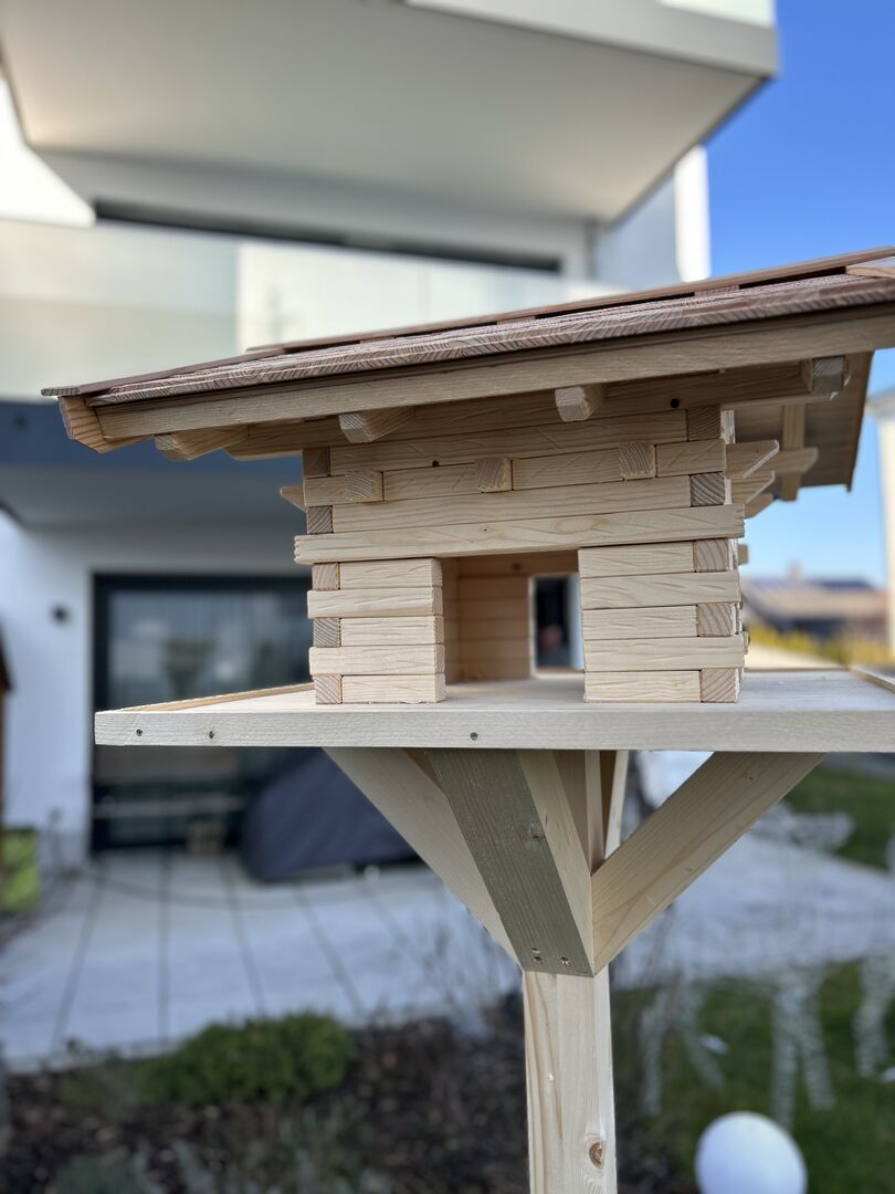 Material & konstruktion - Obehandlat naturligt trä: gran & lärk - Stabilt stativ (valfritt ca 1,40 m eller 1,60 m högt) - Stor matningsplattform: ca 60 × 60 cm - Själva fågelholken: ca 40 × 40 cm, höjd ca 45 cm - Tak av lärkträ, väderbeständig konstruktion - Fint, rustikt utseende tack vare omsorgsfullt hantverk