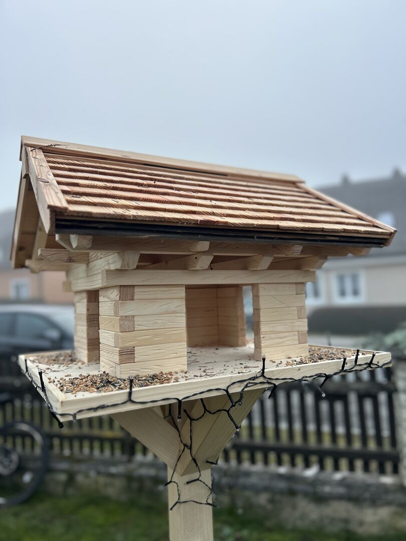 Jag erbjuder en kärleksfullt handgjord fågelmatare i rustik timmerstugastil. Huset är tillverkat helt för hand - inga byggsatser, inga massproducerade varor.