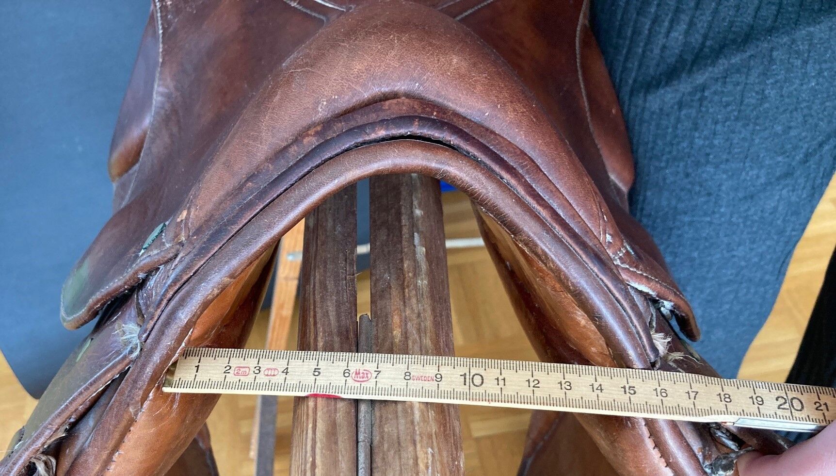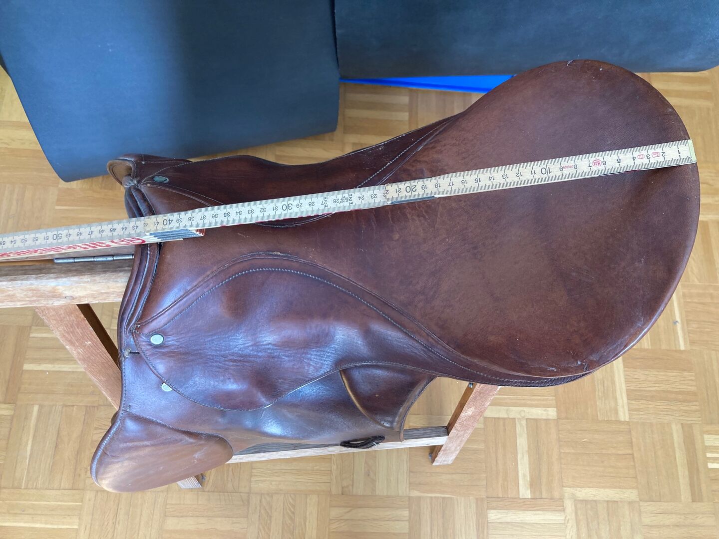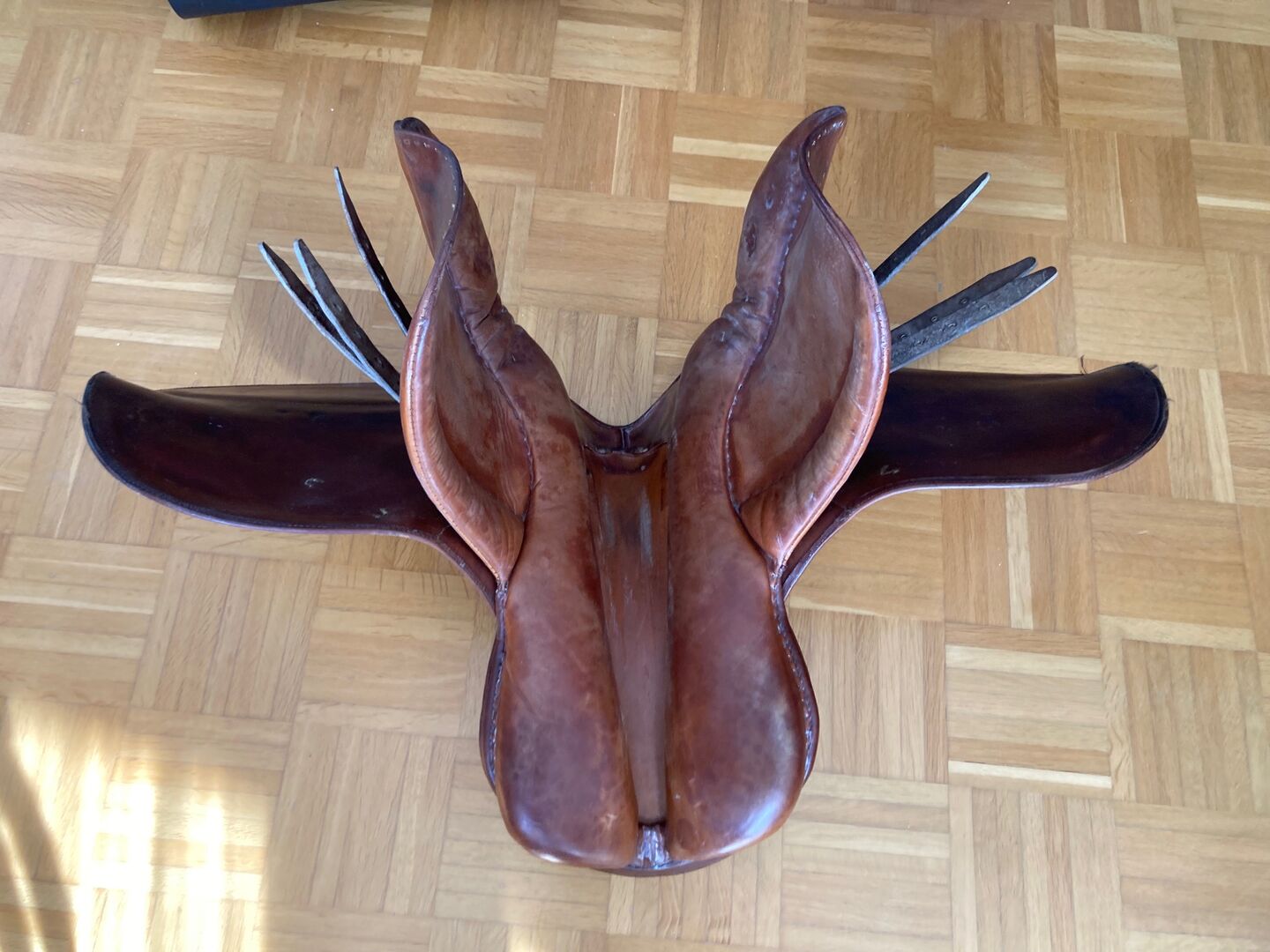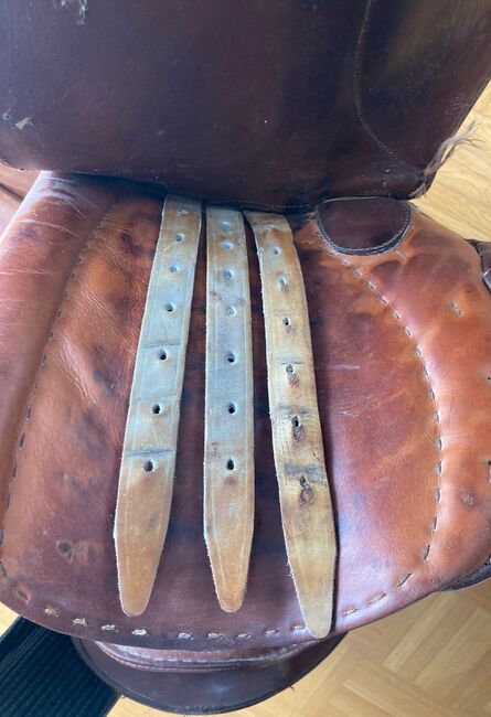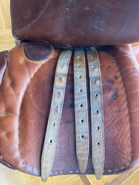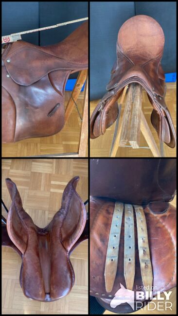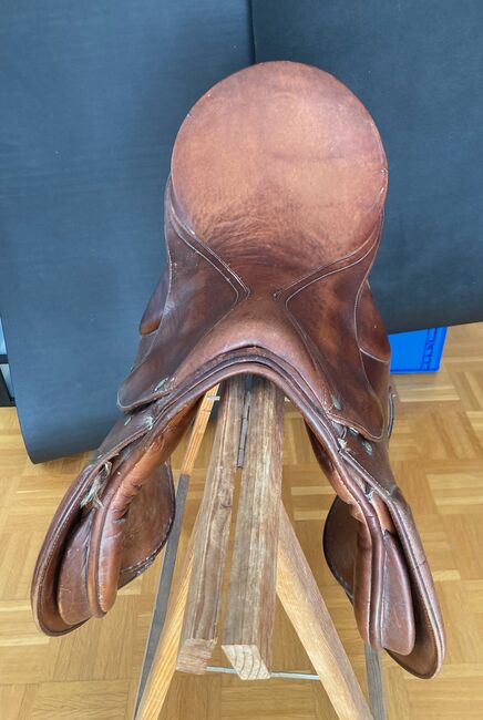 Fälttävlanssadel / Hoppsadel - Välskött fälttävlanssadel med inriktning på hoppning i brunt, med 3 sadelgjordsband på vardera sidan, kammarbredd 16 cm, utan stigbyglar, utan stigläder och utan sadelgjord