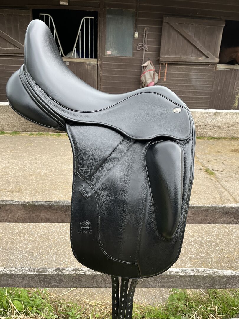 Black Fairfax Gareth dressage saddle with 18” seat medium wide. Bought brand new and has been very well looked after. Comes with Fairfax saddle cover and adjustable knee blocks.