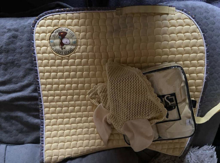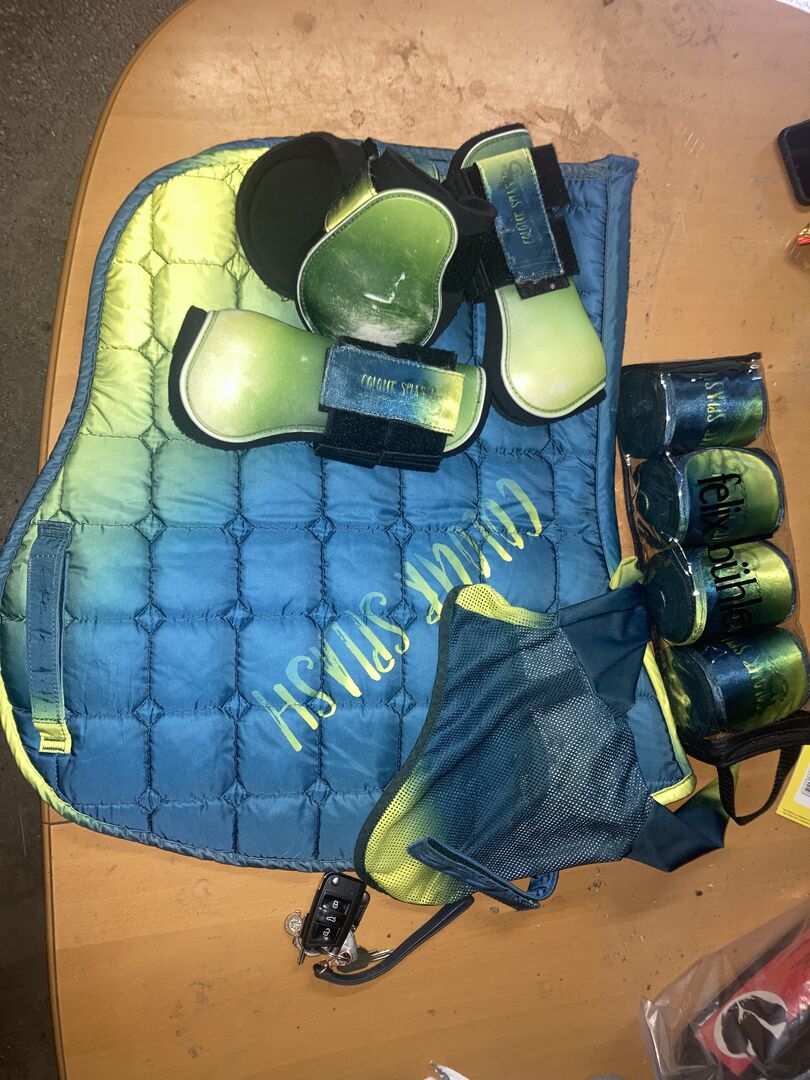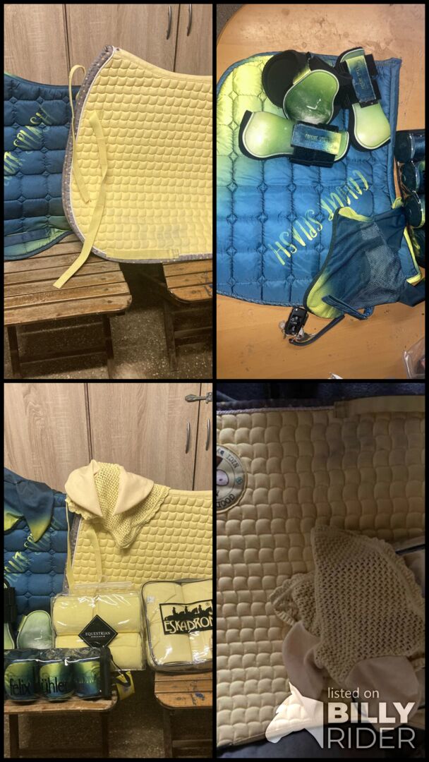 Jag säljer denna vackra färgkombination som ett set. Inkluderat i setet är: 1x Felix Buehler Splash Schabrack DR 1x Felix Bühler Splash Bandage WB 1x Felix Bühler Splash flughuva WB 1x Felix Bühler Splash damasker WB 1x Ridsport Stockholm Citron Bandage Full 1x Eskadron Nici Sadelunderlag DR 1x Eskadron flughuva WB 1x Eskadron Bandage WB 1x Eskadron grimma WB